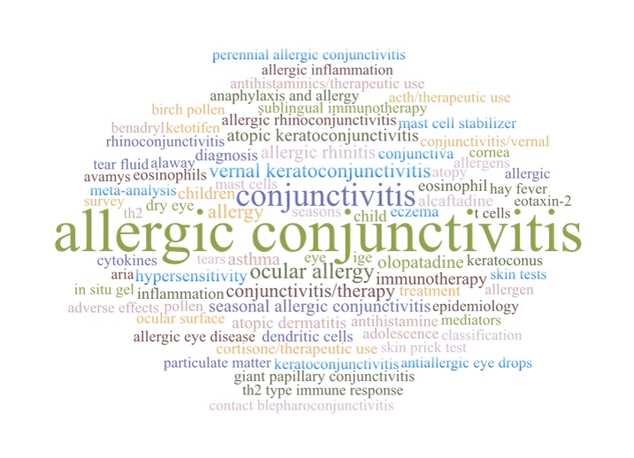近年来,全球范围内聚焦过敏性结膜炎的研究持续升温,学者维持较高的发文量(图1),覆盖儿童、成人等不同人群。研究热点(图2)涵盖发病年龄、致病机制、临床分型、治疗方案等多个研究维度,推动该领域研究不断深化。应急总医院眼科团队从专业角度,带大家全面认识过敏性结膜炎。
