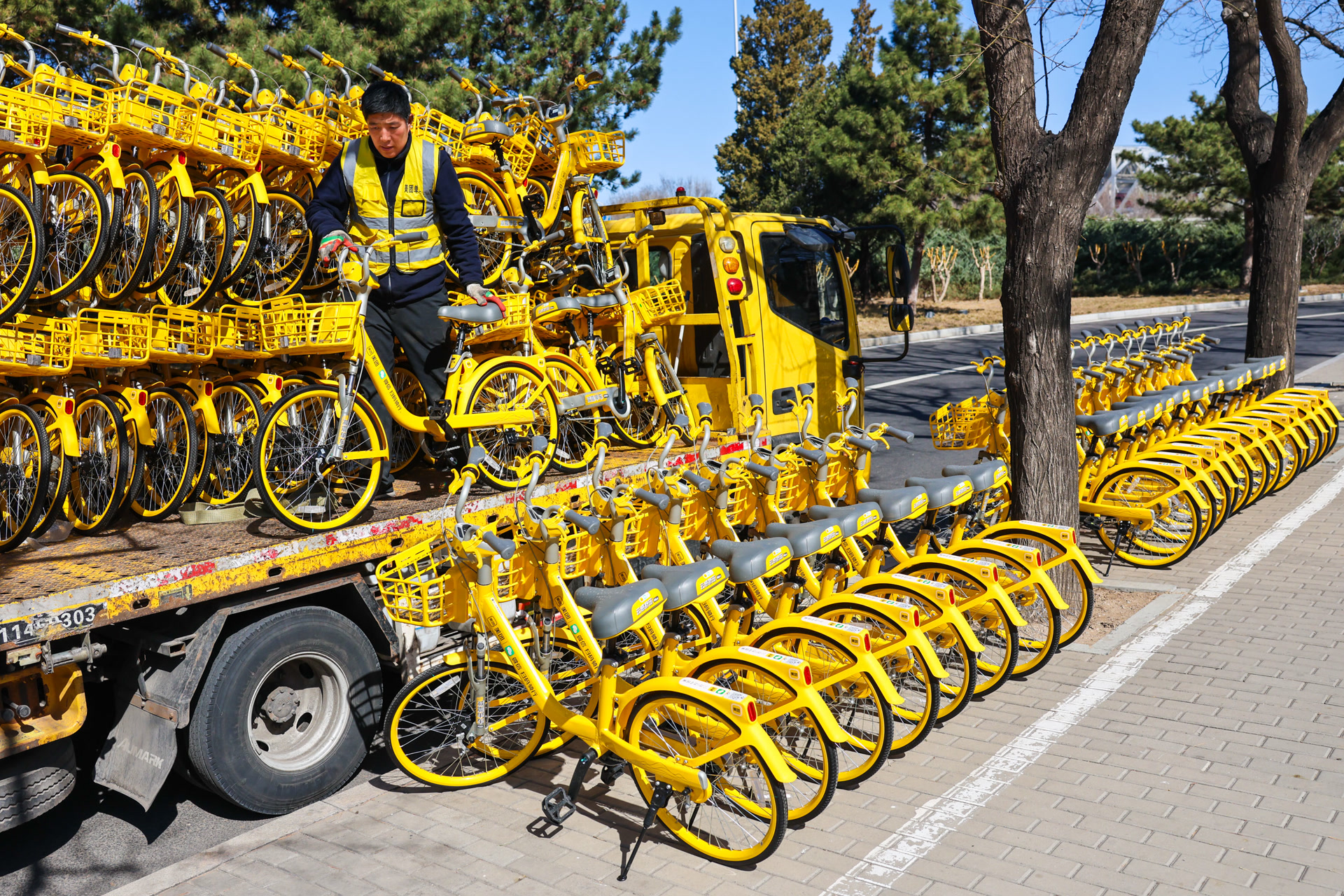 为了保障新车有序置换,美团单车运维人员加班加点作业,将老旧车辆替换成崭新的新款单车。