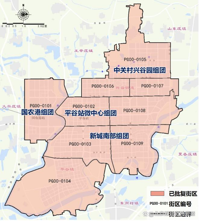 2021年,平谷区启动新城控规编制工作。2022年3月,平谷站微中心组团(PG00—0102街区)获批。2023年7月,中关村兴谷园组团(PG00—0105—0107街区)获批。2024年9月,国农港组团(PG00—0101街区)获批。2026年2月,新城南部组团(PG00—0103、0104、0108、0109街区)获批。至此平谷新城9个街区全部获得批复,搭建起完整的城市功能框架,为下一步区域建设、发展、管理提供法定规划依据,对促进城市高质量发展具有重要意义。