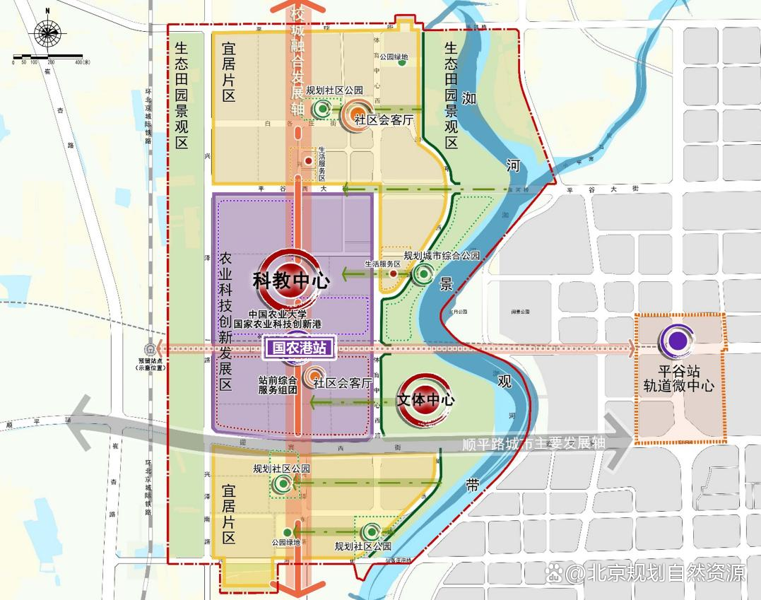 国农港组团(PG00—0101街区) 以农业科技创新为主线,发挥国家农业科技创新港和轨道站点的辐射带动作用,集约高效利用土地资源,提升区域科技创新能力和人才培养质量,引导农业科技创新资源集聚,与平谷区“农业中关村”全域布局紧密联动。增强洳河水岸与街区的互动、渗透,扩展市民绿色休闲空间,构建蓝绿空间网络,强化山水城市形象。通过“街区、校区、园区、社区、景区”五区联动的方式,建设集高教科研、文体休闲、生态居住为一体的城市滨水活力片区,打造洳河畔的农科城。
