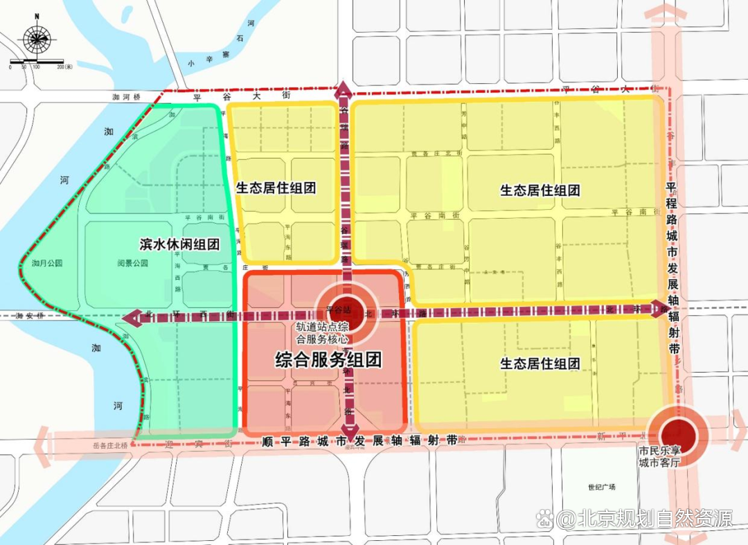 以现状建成区为依托,重点完善城市综合服务功能,持续推进城中村改造,带动本地城镇化、产业特色化发展,打造集公共服务、生态休闲、居住等功能于一体的城市综合片区。规划聚焦城市更新实施,在补齐城市公共服务短板的同时植入“平急两用”功能,促进新老城区共融共生,提升平谷新城综合服务能力。发挥泃、洳两河生态景观价值,激发滨水空间活力,完善绿道慢行体系建设,将水岸从生态资源转变成高净值的资产性空间。