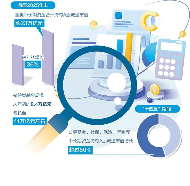 数据是最直观的佐证。截至2025年末,各类中长期资金合计持有A股流通市值约23万亿元,较年初增长36%;权益类基金规模从年初的8.4万亿元增长至11万亿元左右。“十四五”期间,公募基金、社保、保险、年金等中长期资金持有A股流通市值增长超过50%。这些投资周期长、风险承受能力强、价值投资导向鲜明的长钱,正深刻改变着市场生态,成为资本市场行稳致远的“定海神针”。