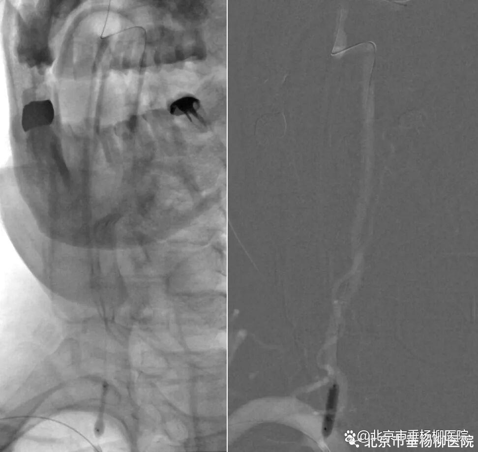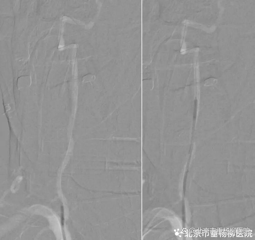 第四步,最终验证。再次造影显示:狭窄消失,支架位置良好。动脉瘤不显影,弹簧圈致密填塞。