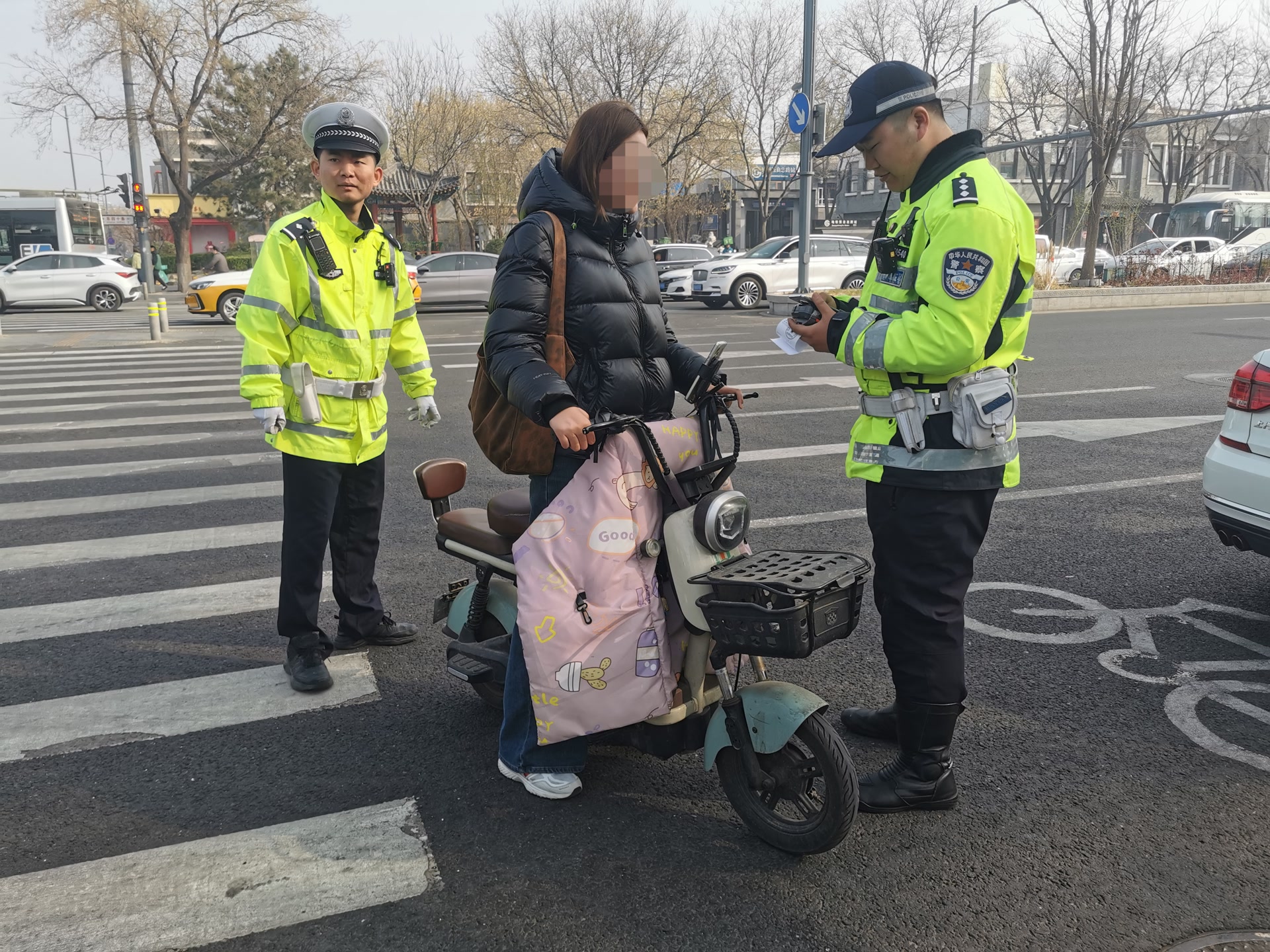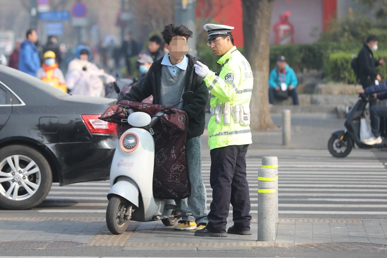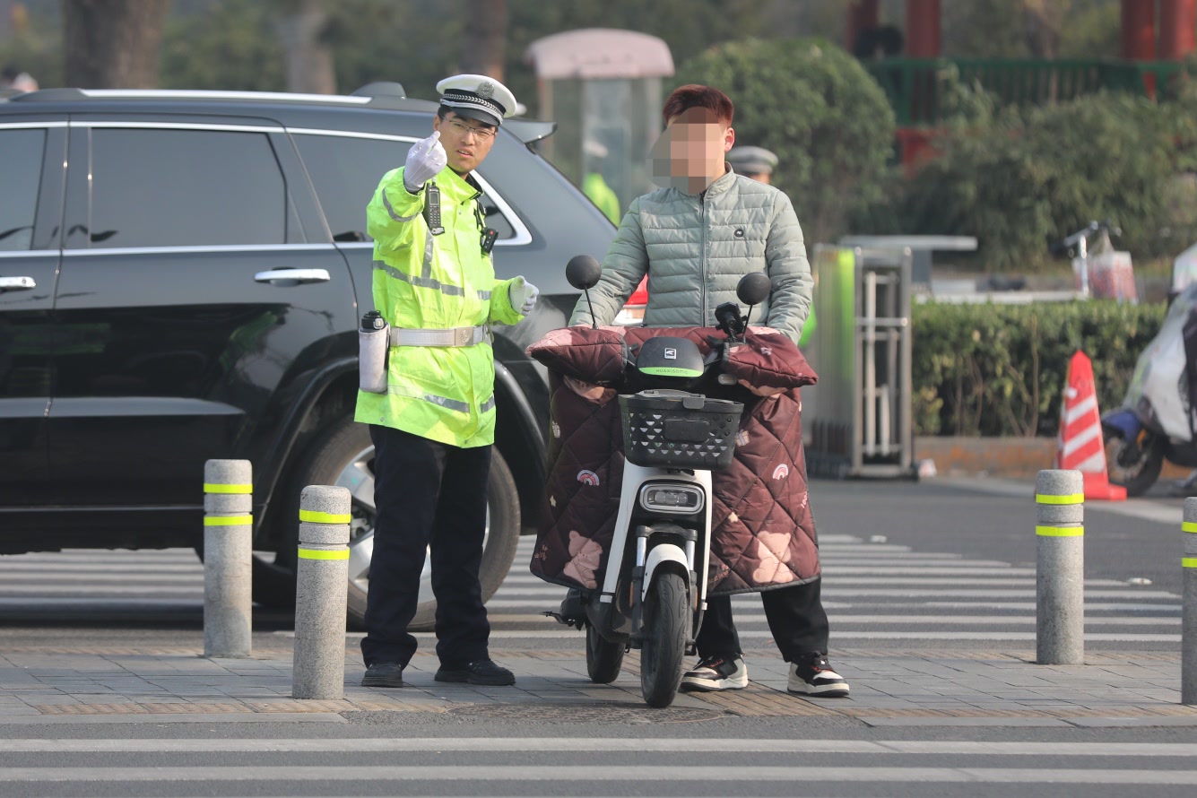 早9点左右,路口东南角,一名老年人试图骑车通过斑马线,被民警拦下。“师傅,斑马线上不能骑,得推着走。”交警表示,此类行为既干扰机动车正常通行,更易引发剐蹭碰撞,一旦事故,骑行人往往受伤严重。