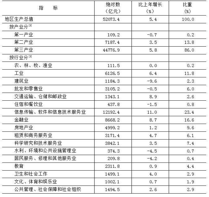 初步核算,全年实现地区生产总值52073.4亿元,按不变价格计算,比上年增长5.4%。其中,第一产业增加值109.2亿元,下降0.7%;第二产业增加值7187.4亿元,增长3.5%;第三产业增加值44776.9亿元,增长5.8%。三次产业构成为0.2︰13.8︰86.0。按常住人口计算,全市人均地区生产总值为23.9万元(按年平均汇率折算为3.3万美元)。