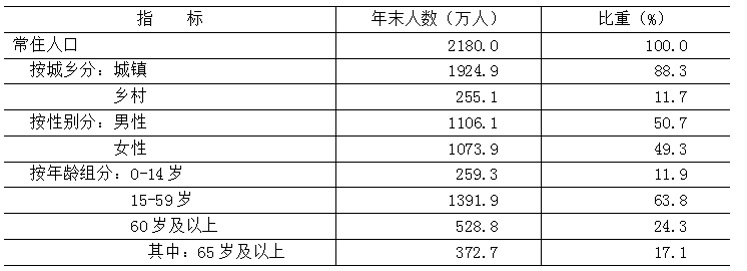 年末全市常住人口[4]2180.0万人,比上年末减少3.2万人。其中,城镇人口1924.9万人,占常住人口的比重为88.3%。常住人口出生率为5.55‰,死亡率为6.28‰,自然增长率为-0.73‰。全年城镇新增就业33.0万人,比上年增加3.1万人。城镇调查失业率均值为4.1%。