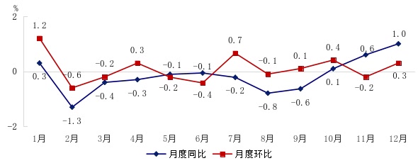 全年居民消费价格比上年下降0.1%。工业生产者出厂价格下降1.7%,工业生产者购进价格下降1.8%。农产品生产者价格下降1.9%。12月份,新建商品住宅销售价格环比指数为99.6、同比指数为97.6;二手住宅销售价格环比指数为98.7、同比指数为91.5。