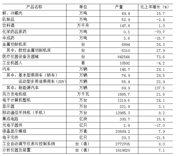 全年实现工业增加值6126.5亿元,按不变价格计算,比上年增长6.4%。其中,规模以上工业[7]增加值按可比价格计算,增长6.5%;重点行业中,计算机、通信和其他电子设备制造业增长20.2%,汽车制造业增长17.7%,电力、热力生产和供应业增长5.5%,医药制造业下降8.6%,五大装备制造业[8]增长4.9%。规模以上工业实现销售产值27787.0亿元,增长6.2%。其中,内销产值25673.6亿元,增长6.2%;出口交货值2113.4亿元,增长6.4%。新能源汽车、锂离子电池、服务机器人、风力发电机组等高技术或新兴领域产品产量分别增长137.5%、117.6%、47.6%和21.6%。