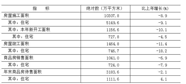 全年房地产开发投资比上年下降15.5%。全市房屋施工面积10307.8万平方米,比上年下降8.9%。其中,本年新开工面积1156.6万平方米,下降10.1%。全年房屋竣工面积1464.8万平方米,下降11.4%。全年新建商品房销售面积1041.0万平方米,下降6.9%。二手房交易网签面积[12]1682.7万平方米,增长0.9%。