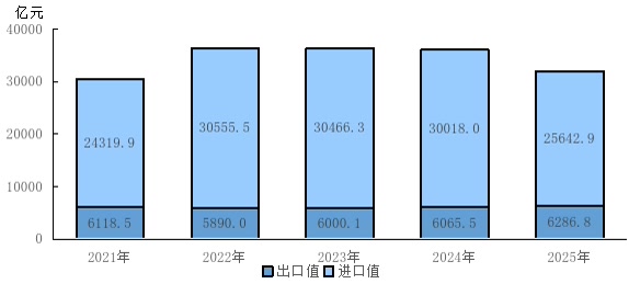 图6 2021—2025年北京地区货物进口值和出口值