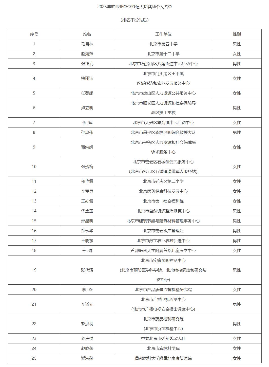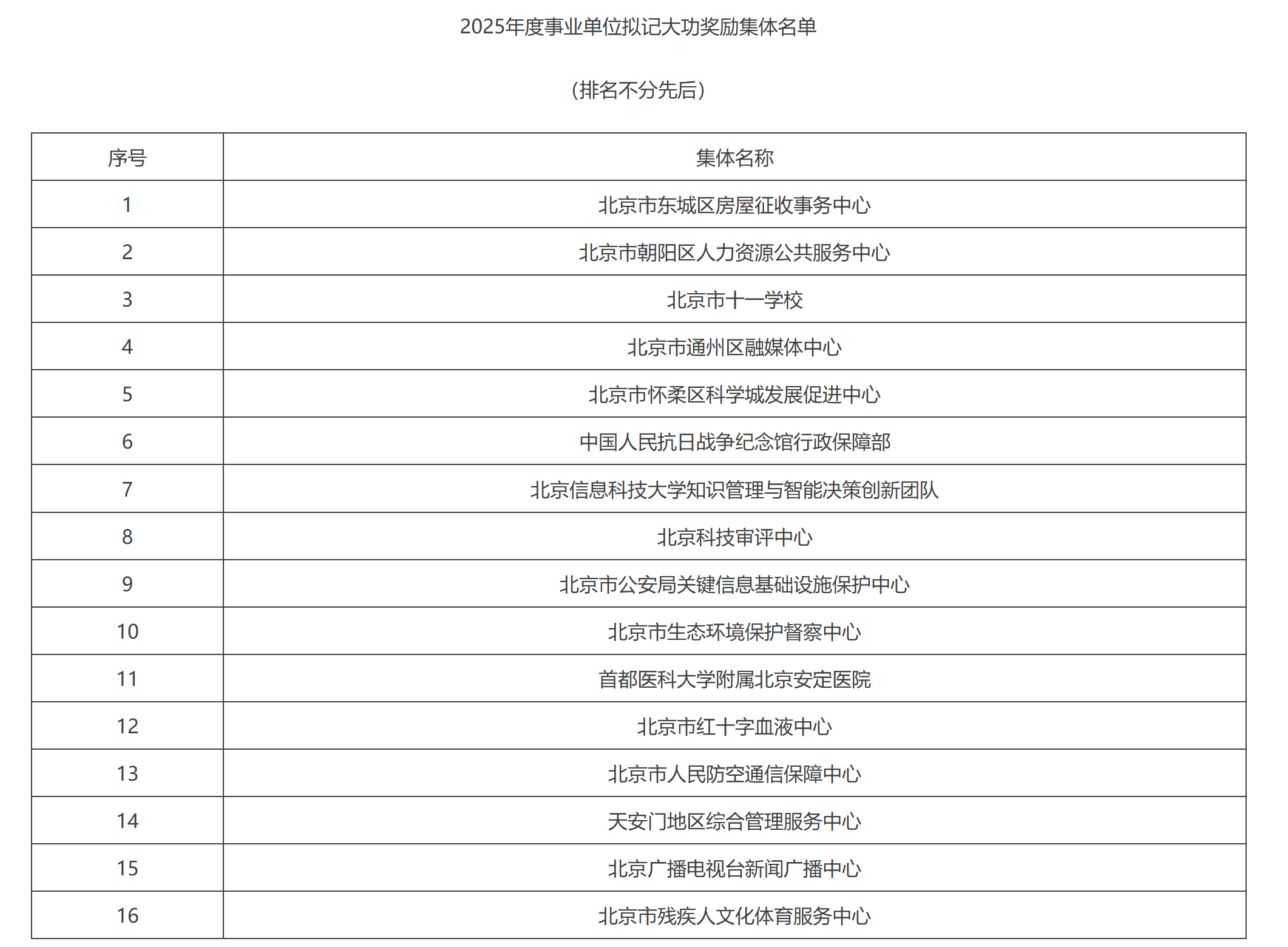 根据《北京市事业单位工作人员奖励实施办法》《关于做好全市2025年事业单位工作人员年度考核奖励工作的通知》有关要求,经市级事业单位奖励评审委员会评议,拟对北京市东城区房屋征收事务中心、北京市第四中学马景林等16家集体和25名个人给予记大功奖励,现予以公示。如有异议,可向北京市人力资源和社会保障局反映。