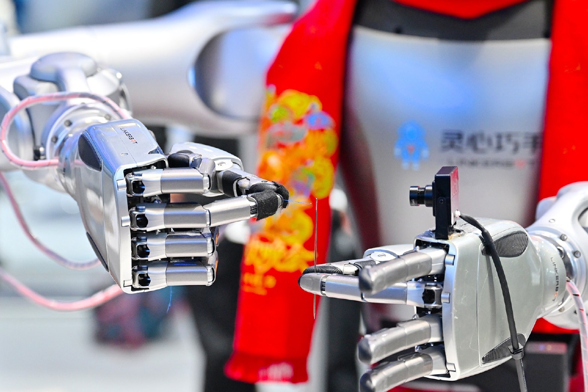 机器人用其灵活的“手指”穿针引线,动作精准迅捷。常鸣/摄