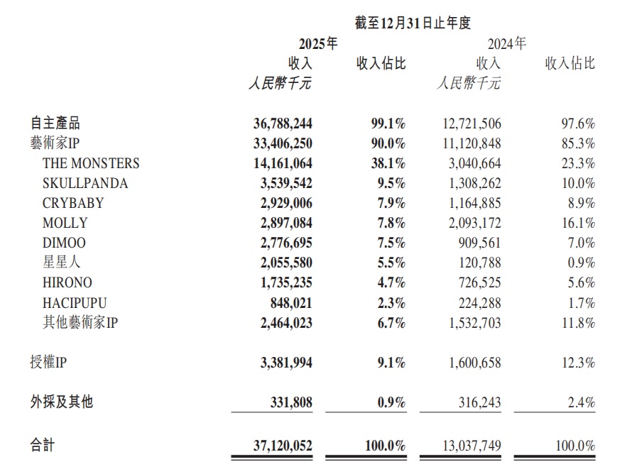 从IP结构看,拉布布所属的精灵天团全年收入141.6亿元,同比增长365.7%,成为集团首个百亿级IP。骷髅熊猫(SKULLPANDA)、哭娃(CRYBABY)、茉莉(MOLLY)、迪莫(DIMOO)、星星人等6大IP营收均突破20亿元,17个IP营收突破1亿元。其中SKULLPANDA营收35.4亿元,同比增长170.6%;CRYBABY营收29.3亿元,同比增长151.4%;DIMOO营收27.8亿元,同比增长205.3%。