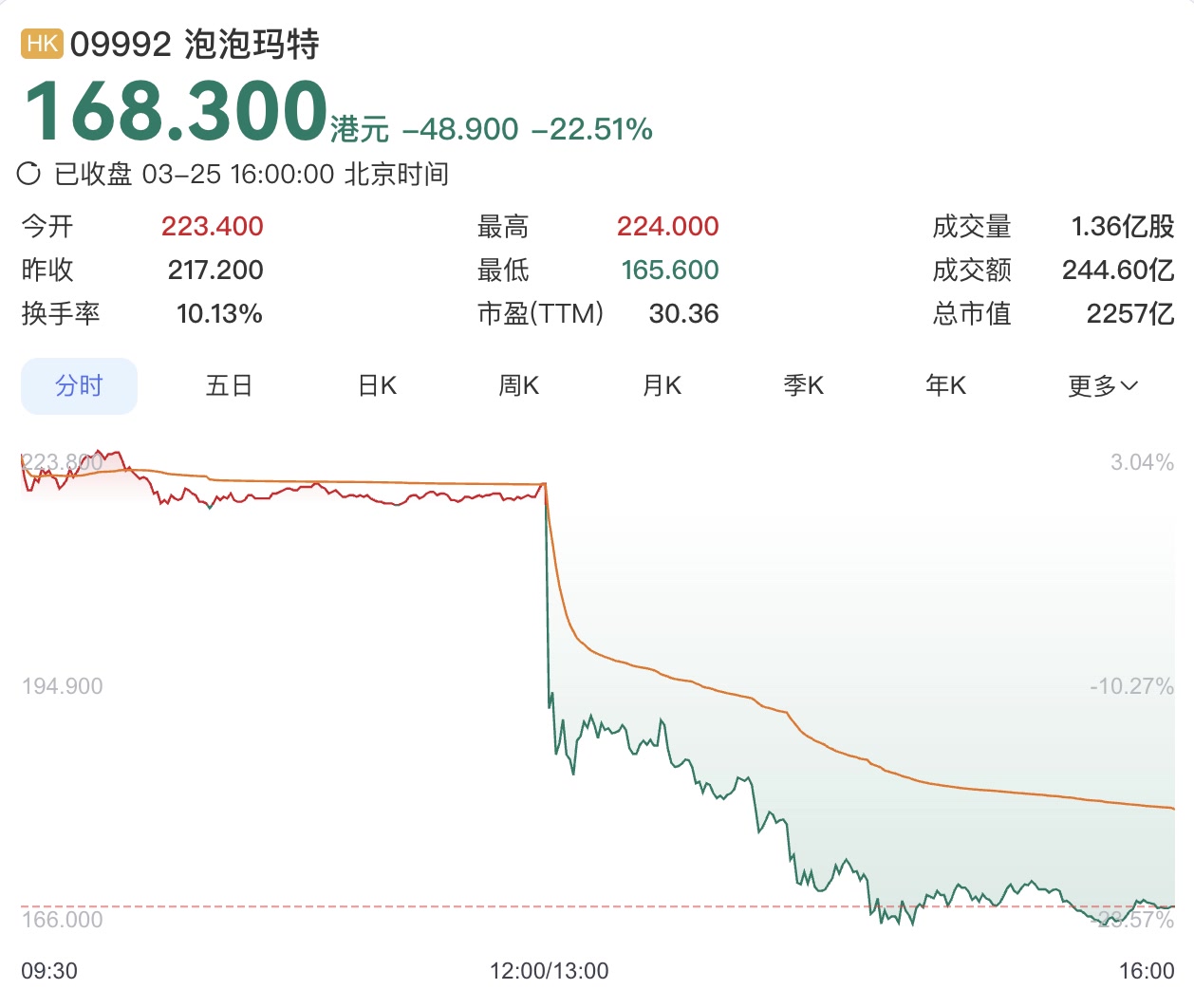 值得注意的是,财报发布当日,港股泡泡玛特午后大幅下跌,盘中跌幅超23%,收盘报168.3港元/股,下跌22.51%。