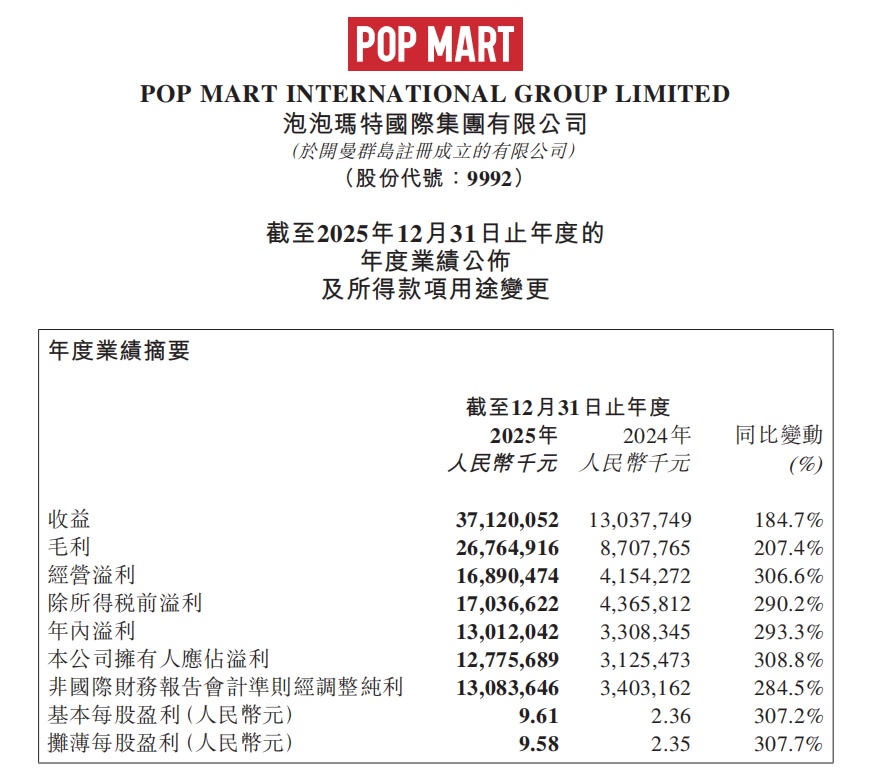3月25日,泡泡玛特国际集团发布2025年财报。财报显示,2025年集团营收371.2亿元,同比增长184.7%,经调整净利润130.8亿元,同比增长284.5%。集团营收首次突破300亿元大关,其中拉布布(LABUBU)所属的THE MONSTERS(精灵天团)营收首次突破百亿元。