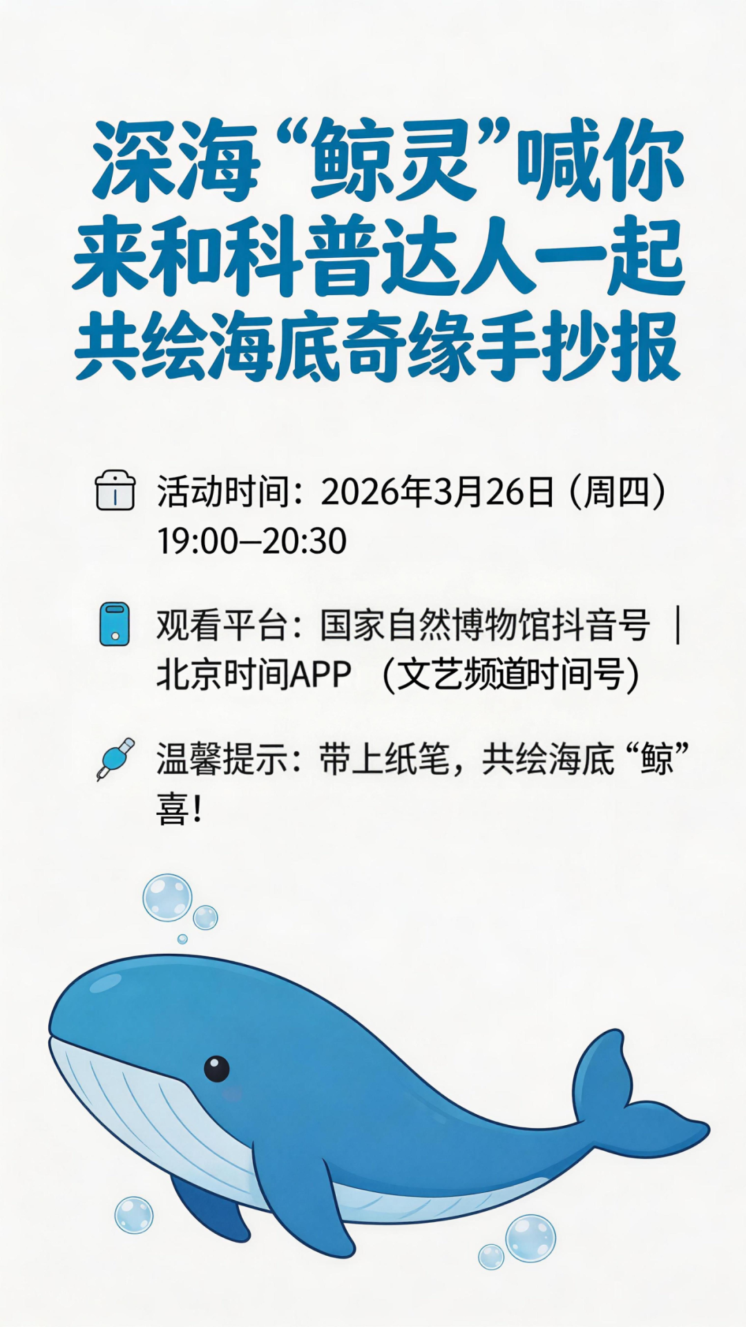 与主持人、科普达人一起,边看特展边创作,完成独一无二的《深海探秘手抄报》!国家自然博物馆正在火热上演的“鲸·奇—海洋深深遇见鲸”特展,不仅让你近距离感受巨鲸的震撼,更带来一场知识与创意碰撞的线上盛宴!我们特别策划了一场沉浸式科普直播,邀请全国的小探险家们和家长们,一起踏上这场别开生面的“深海探险”!