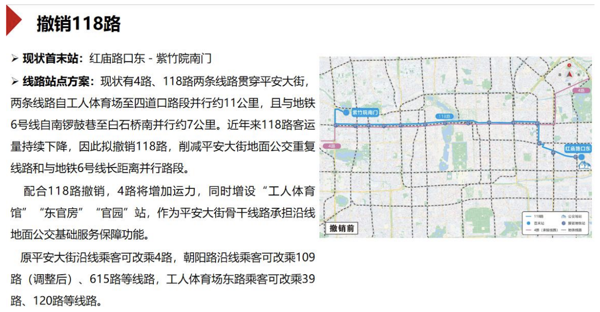 对于计划撤销118路,征求意见稿也给出了说明:目前,4路、118路均贯穿平安大街,两条线路自工人体育场至四道口路段并行约11公里,且与地铁6号线自南锣鼓巷至白石桥南并行约7公里。近年来,118路客运量持续下降,因此该方案拟撤销118路,削减平安大街地面公交重复线路和与地铁6号线长距离并行路段。