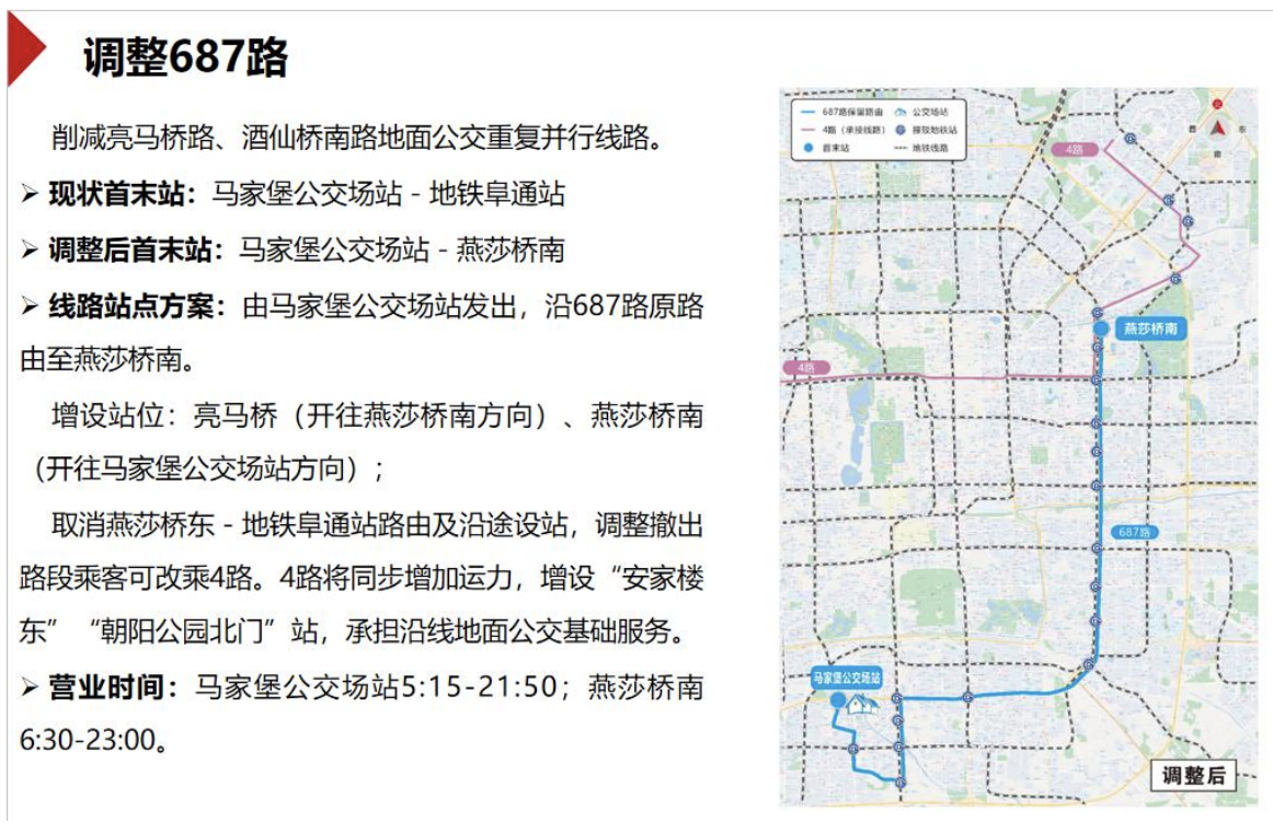 此外,此轮调整拟调整687路,削减亮马桥路、酒仙桥南路地面公交重复并行线路。增设站位:亮马桥(开往燕莎桥南方向)、燕莎桥南(开往马家堡公交场站方向);取消燕莎桥东至地铁阜通站路线及沿途设站,调整撤出路段乘客可改乘4路。4路将同步增加运力,增设“安家楼东”“朝阳公园北门”站,承担沿线地面公交基础服务。
