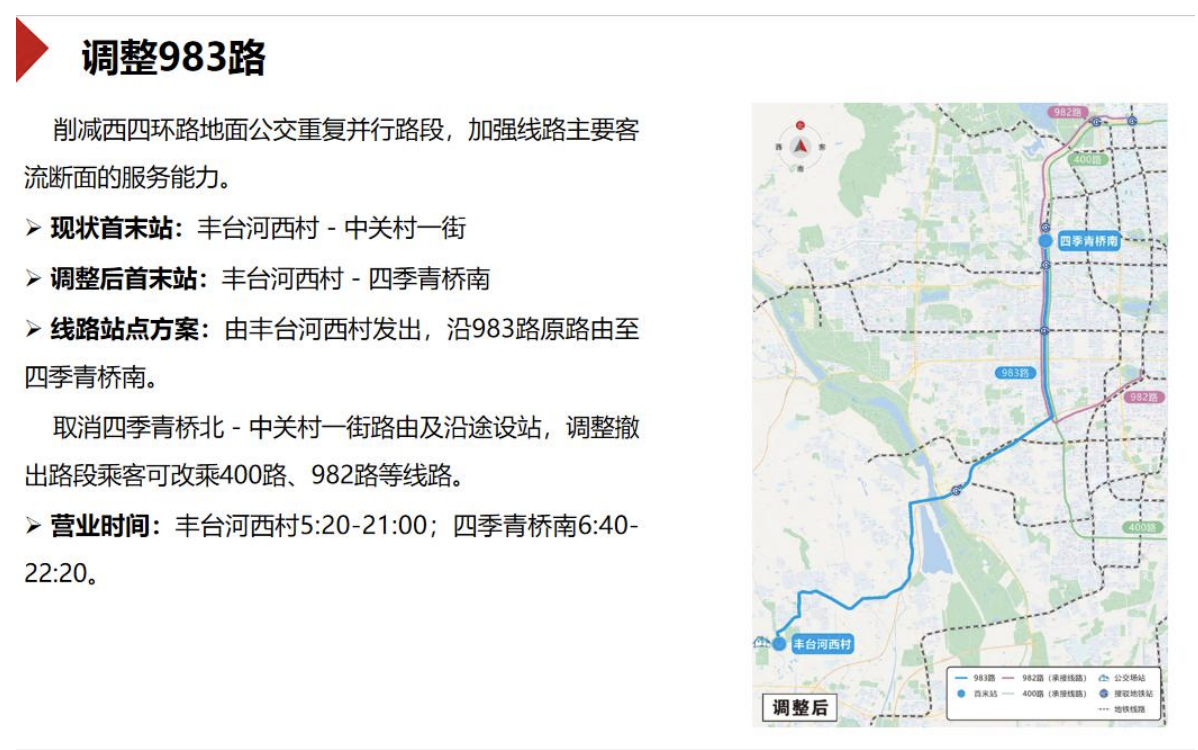 拟调整983路,削减西四环路地面公交重复并行路段,加强线路主要客流断面的服务能力。线路由丰台河西村发出,沿983路原路线至四季青桥南。取消四季青桥北-中关村一街路由及沿途设站,调整撤出路段乘客可改乘400路、982路等线路。