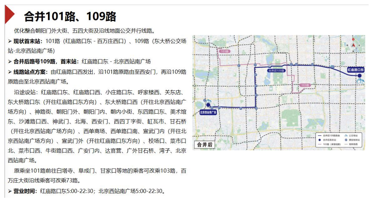 根据方案征求意见稿,拟合并101路、109路,优化整合朝阳门外大街、五四大街及沿线地面公交并行线路,合并后路号为109路,首末站为红庙路口东至北京西站南广场。线路由红庙路口西发出,沿101路原路线至西安门,再沿109路原路线至北京西站南广场。原乘坐101路前往白塔寺、阜成门、甘家口等地的乘客可改乘103路,百万庄大街沿线乘客可改乘73路。