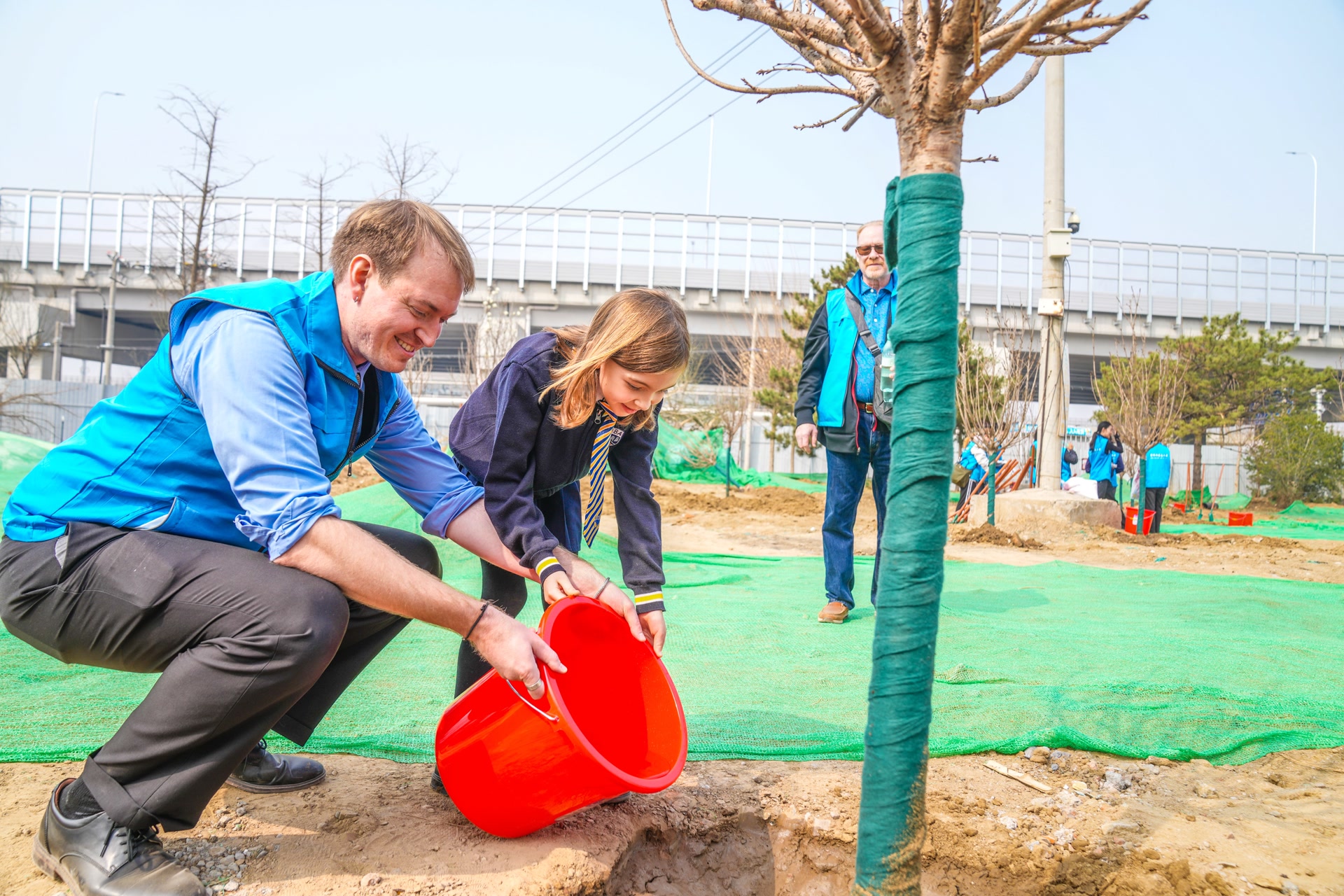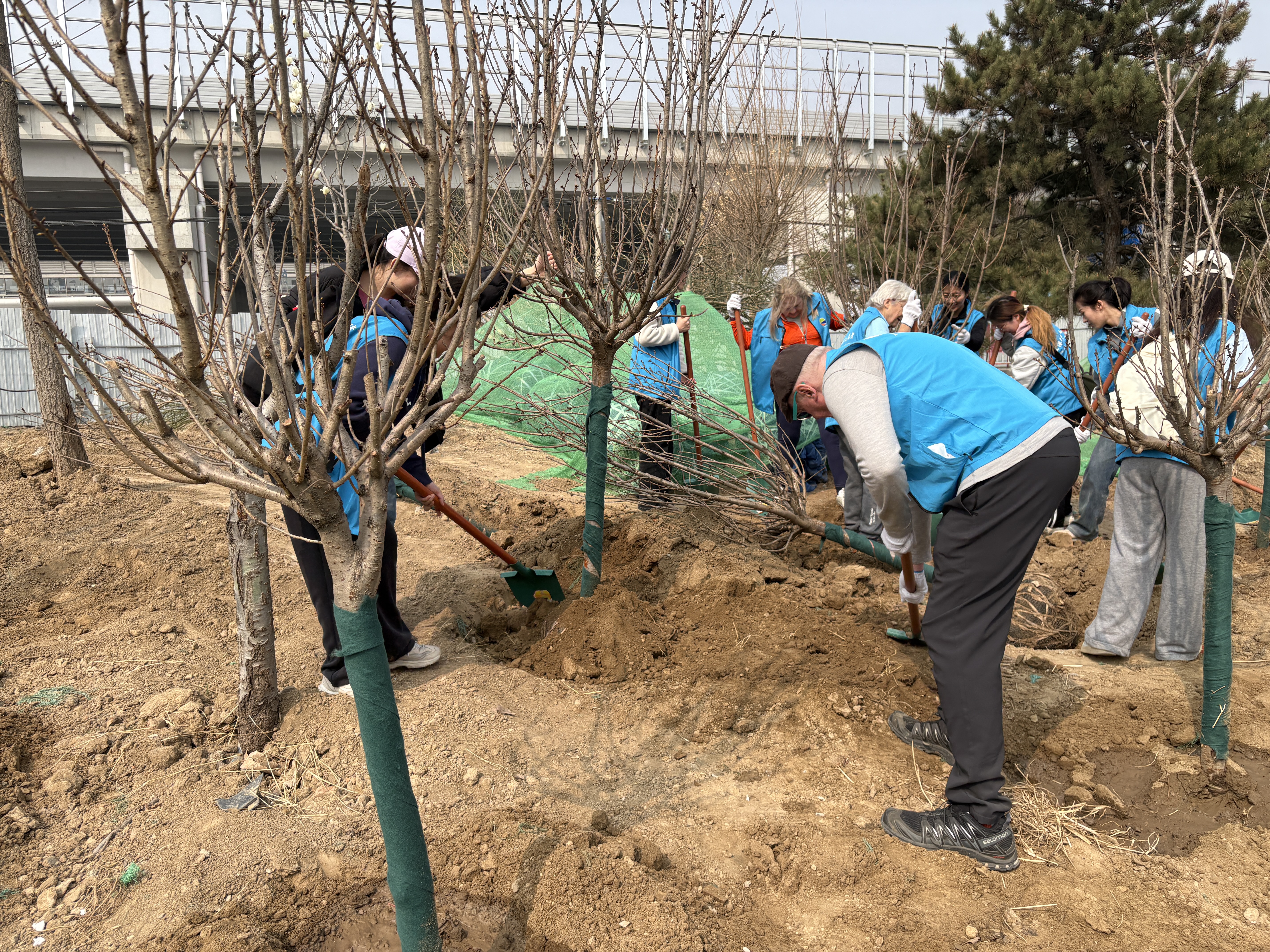 植树现场一派忙碌景象:有人俯身挖坑,有人扶苗培土,有人挥锹填土,还有人提水浇灌。不少中外志愿者用中英文交流协作,在亲手种下的树苗前合影留念,气氛热烈而融洽。
