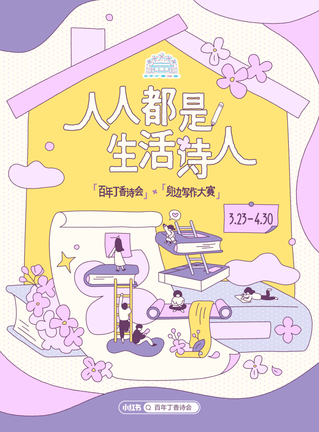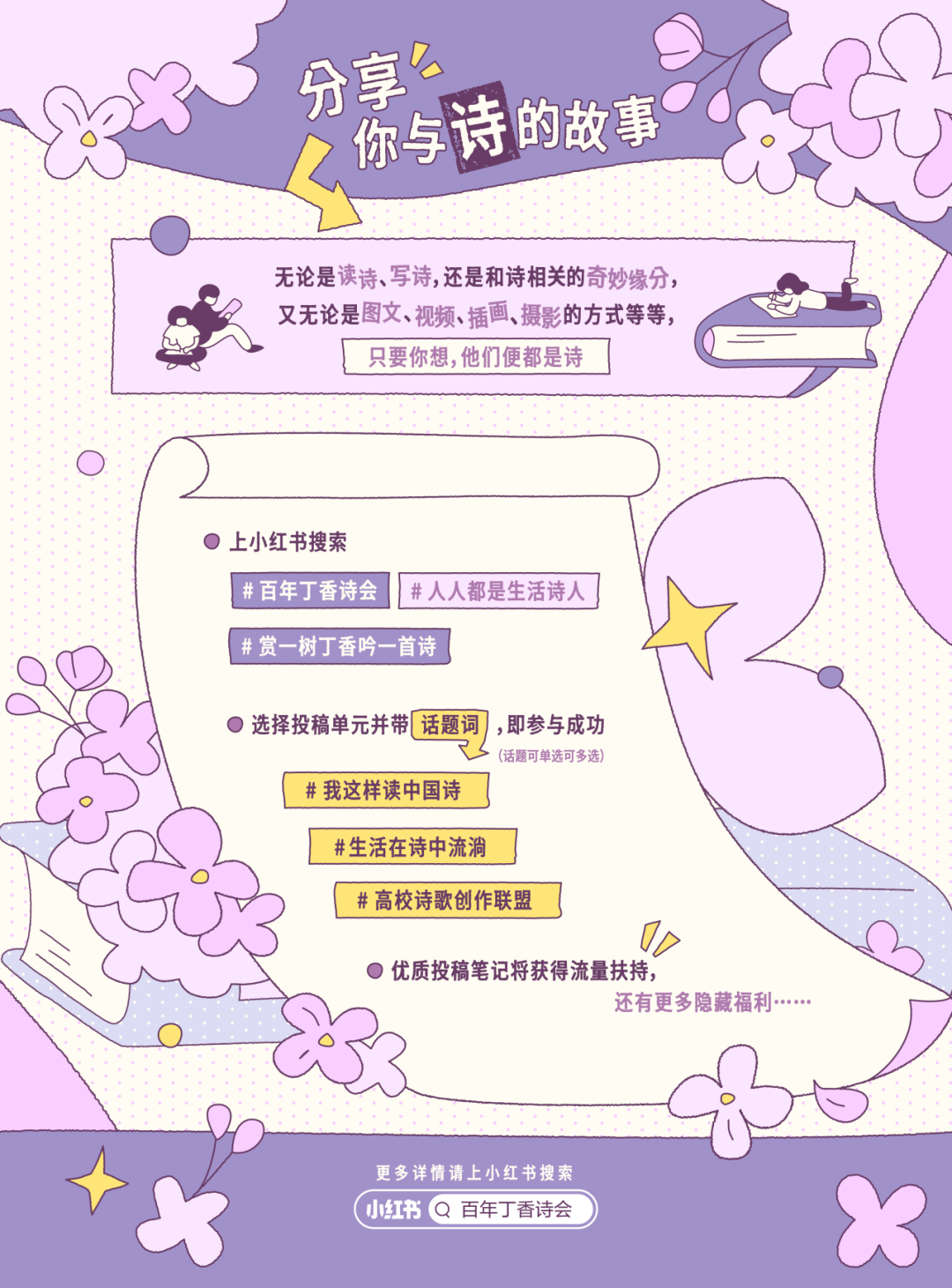 1、小红书搜索#人人都是生活诗人 #百年丁香诗会 #赏一树丁香吟一首诗,发布符合主题的笔记,即可参与线上征集;