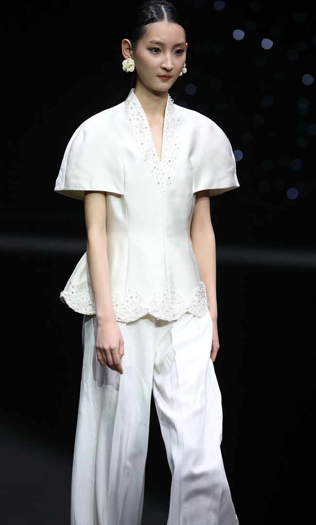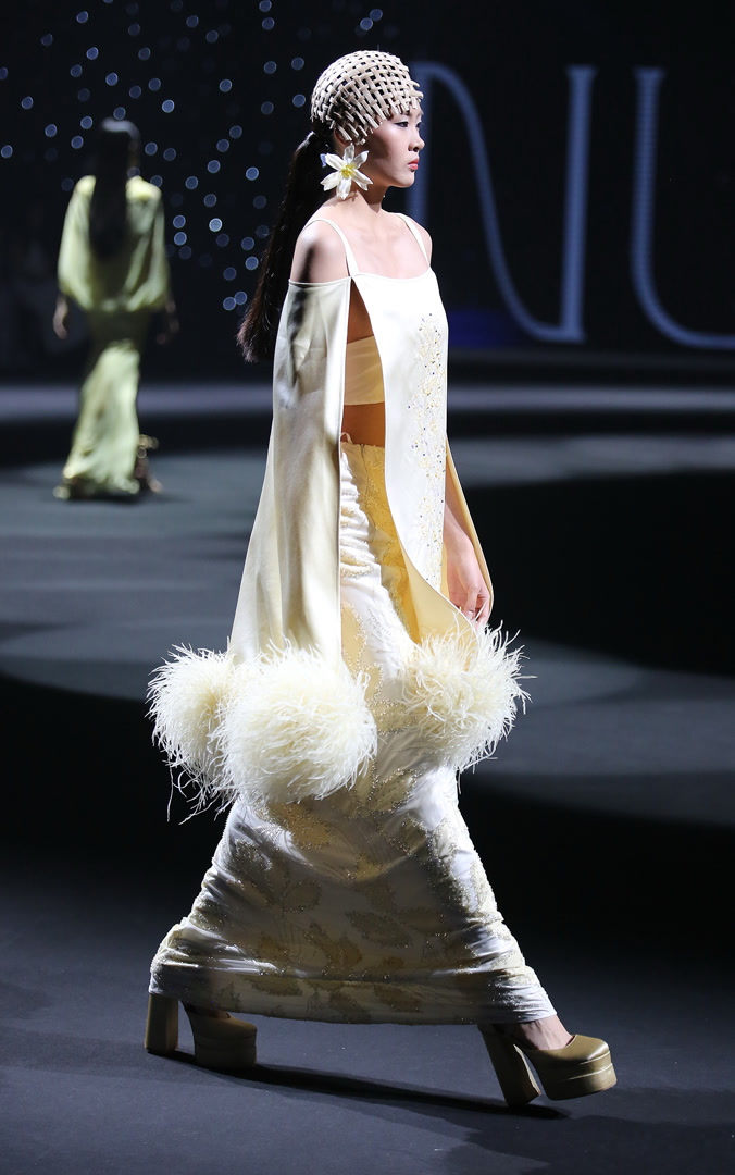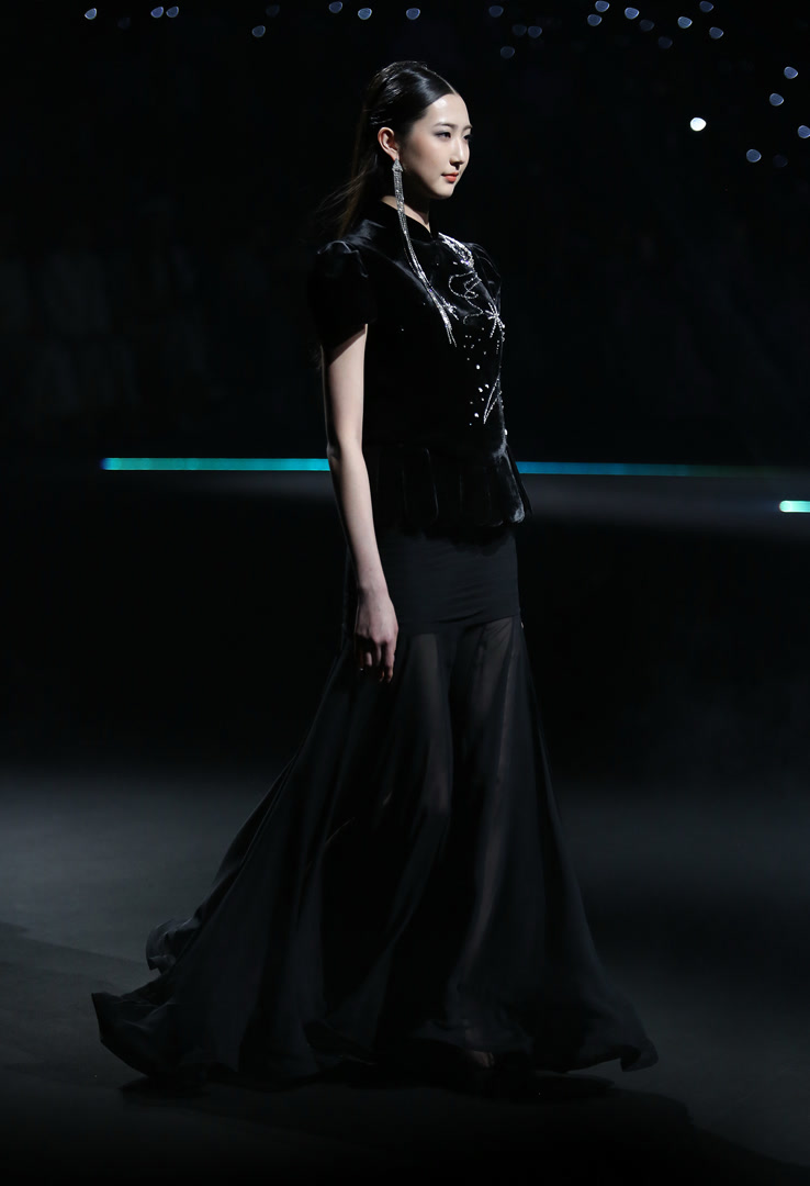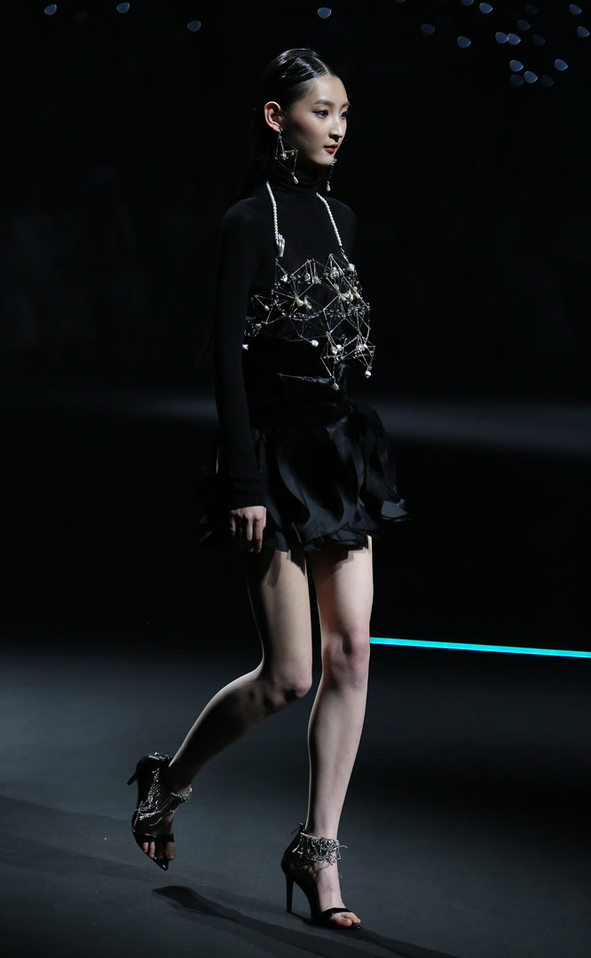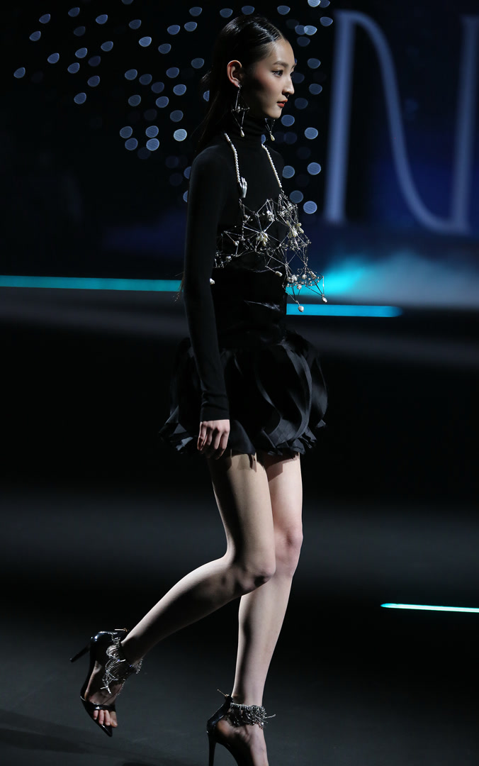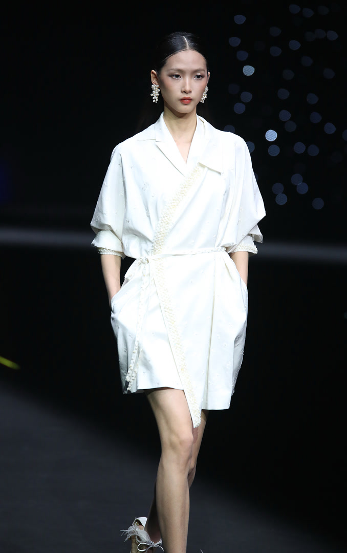 整场发布以服饰为媒介,通过材质肌理的精微表达与廓形的诗意构造,诠释“仰望星空,回望内心”的概念,亦是一次向内心深处探寻的旅程。从面料选择到工艺细节,每一处都可见设计师对“向内生长”的践行:柔软与挺括并存,流光与哑光交织,仿佛星辰在夜色中明灭。而“向外发光”的理念则透过结构上的巧思与整体气质的铺陈,让每一件服饰都成为穿着者内心光芒的外化。