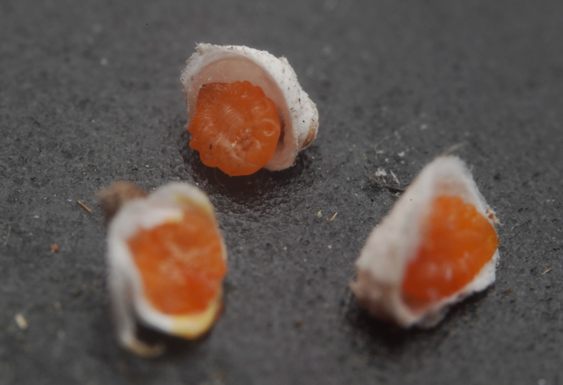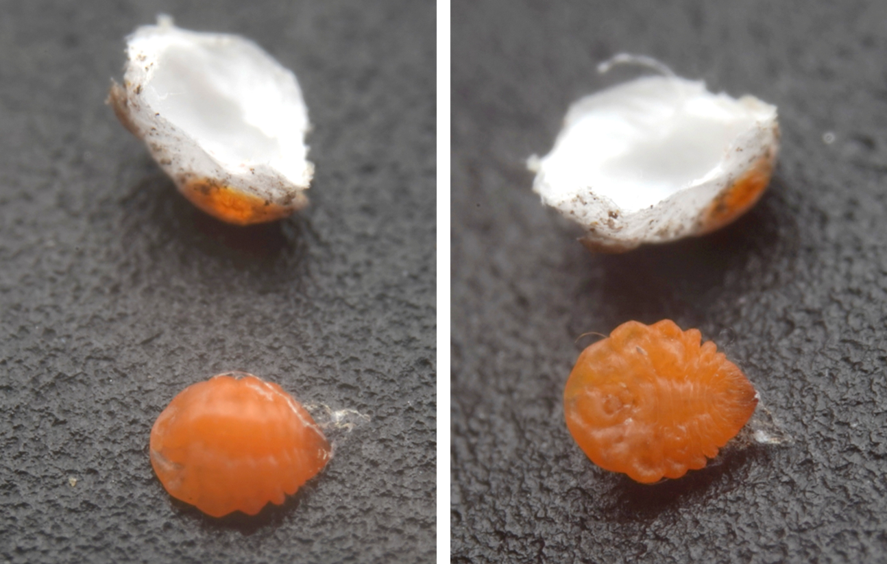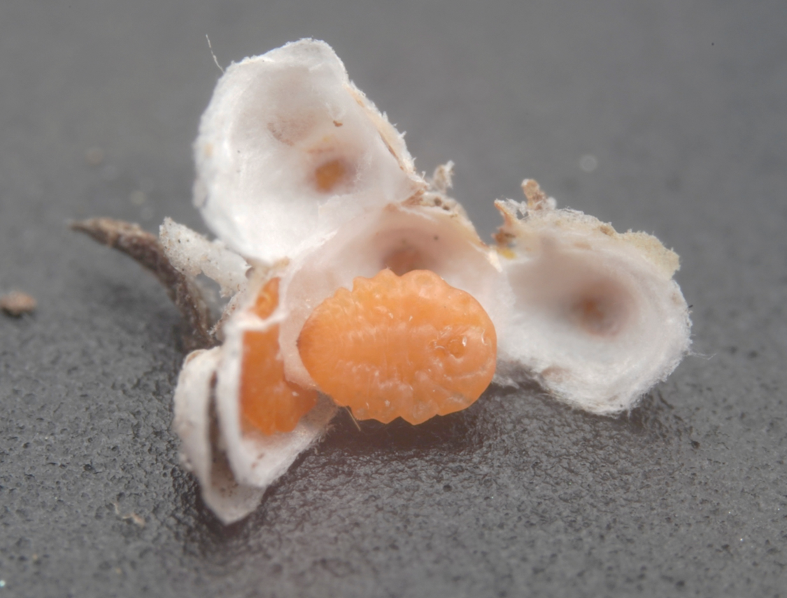 用昆虫针轻轻挑下几个,翻过来——咦,一点橘色露出来。完全没想到,白壳之下,竟是这么鲜艳明亮的色彩吗?!