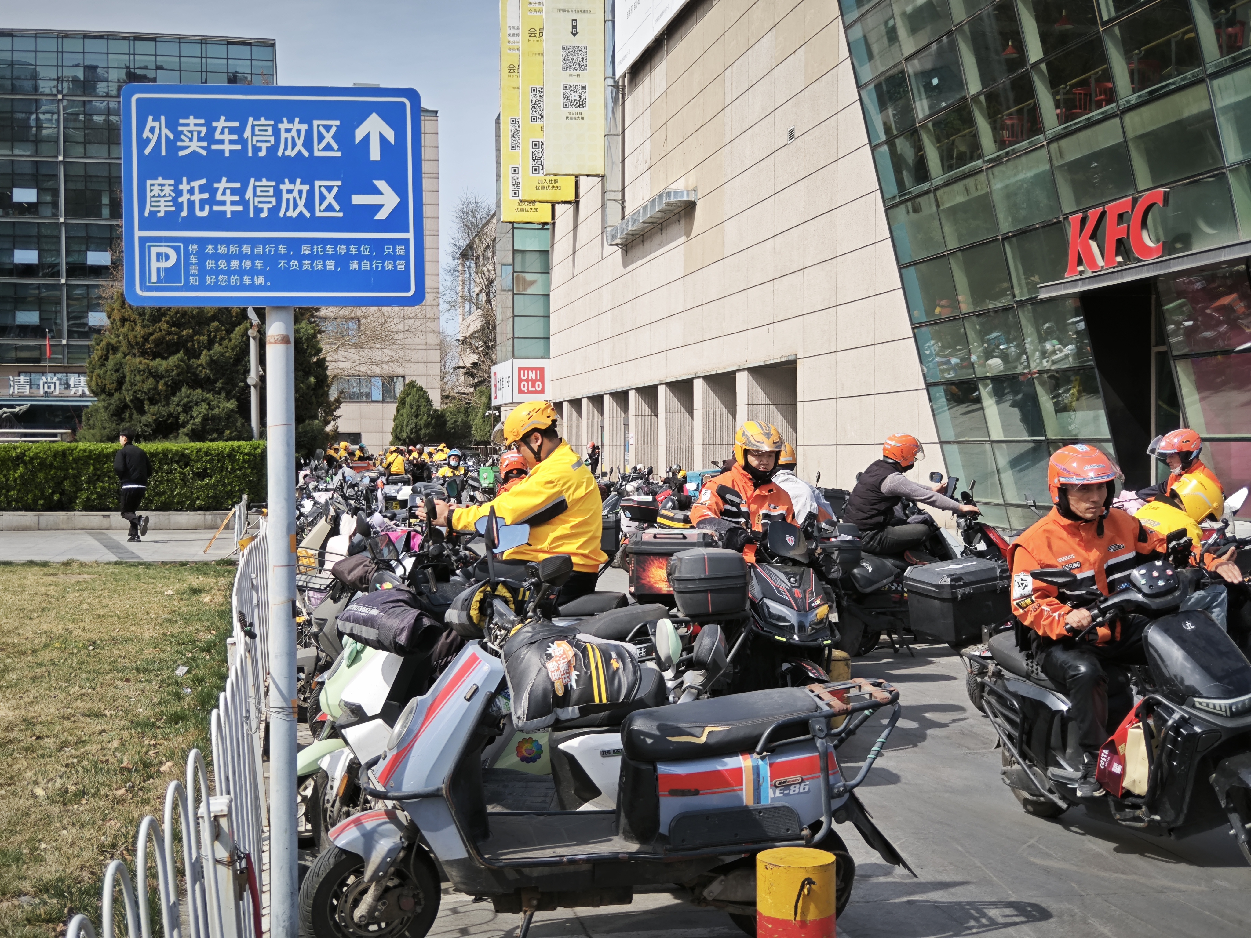 上地南口商圈,是海淀区重要的商业集中区域,硅谷亮城与华联商厦周边业态聚集、人流量大,外卖、共享单车、员工及顾客四类车辆交织混行,治理难度突出。3月27日中午,记者在该商圈看到,不少外卖车辆陆续赶来,将车停放在商场两侧新开辟的“外卖车停放区”,再去商场内取餐。而这样的区域,过去曾是机动车停车位。