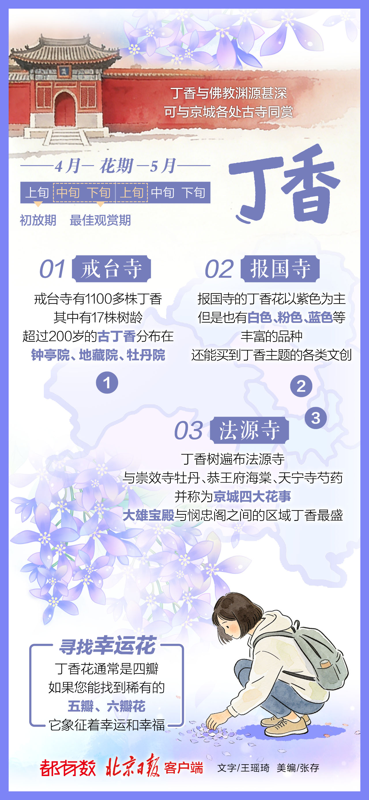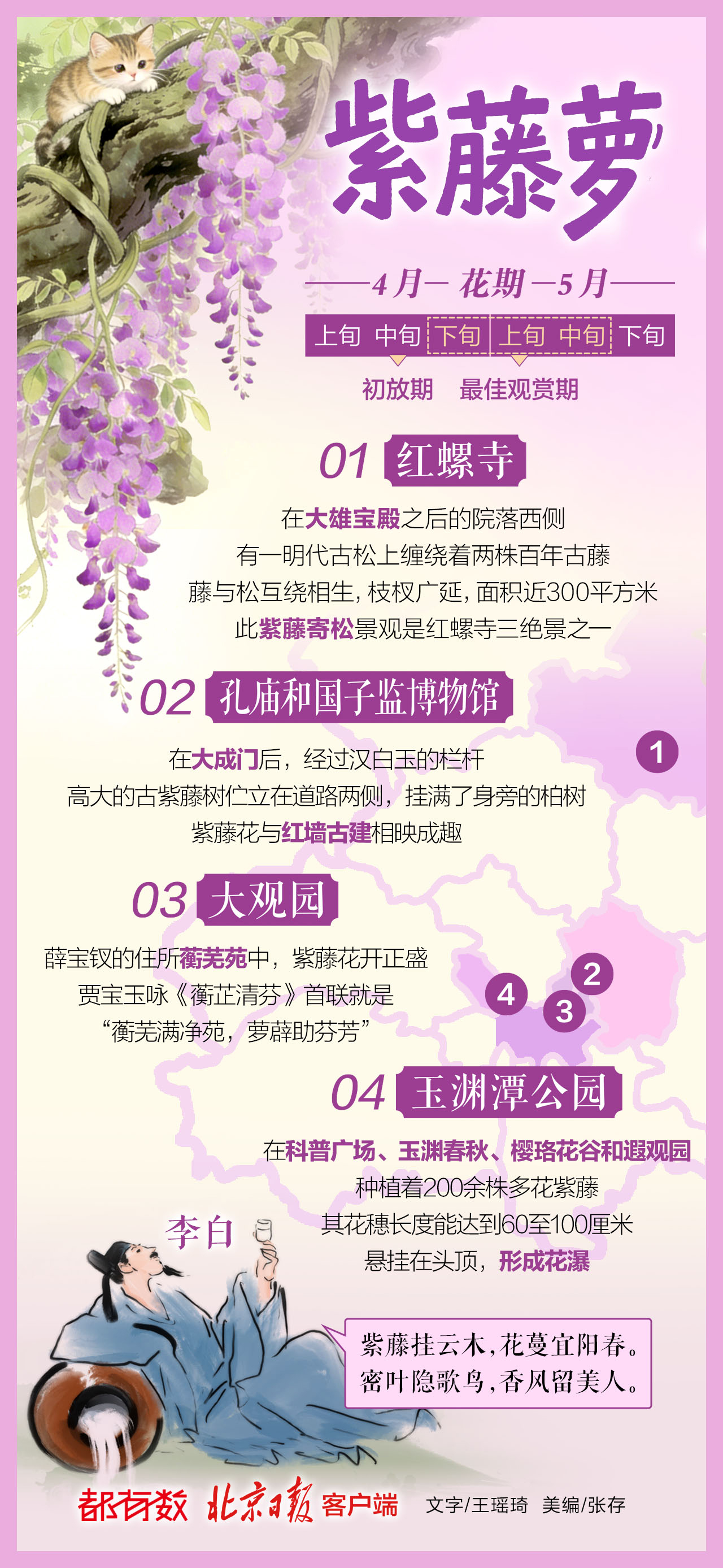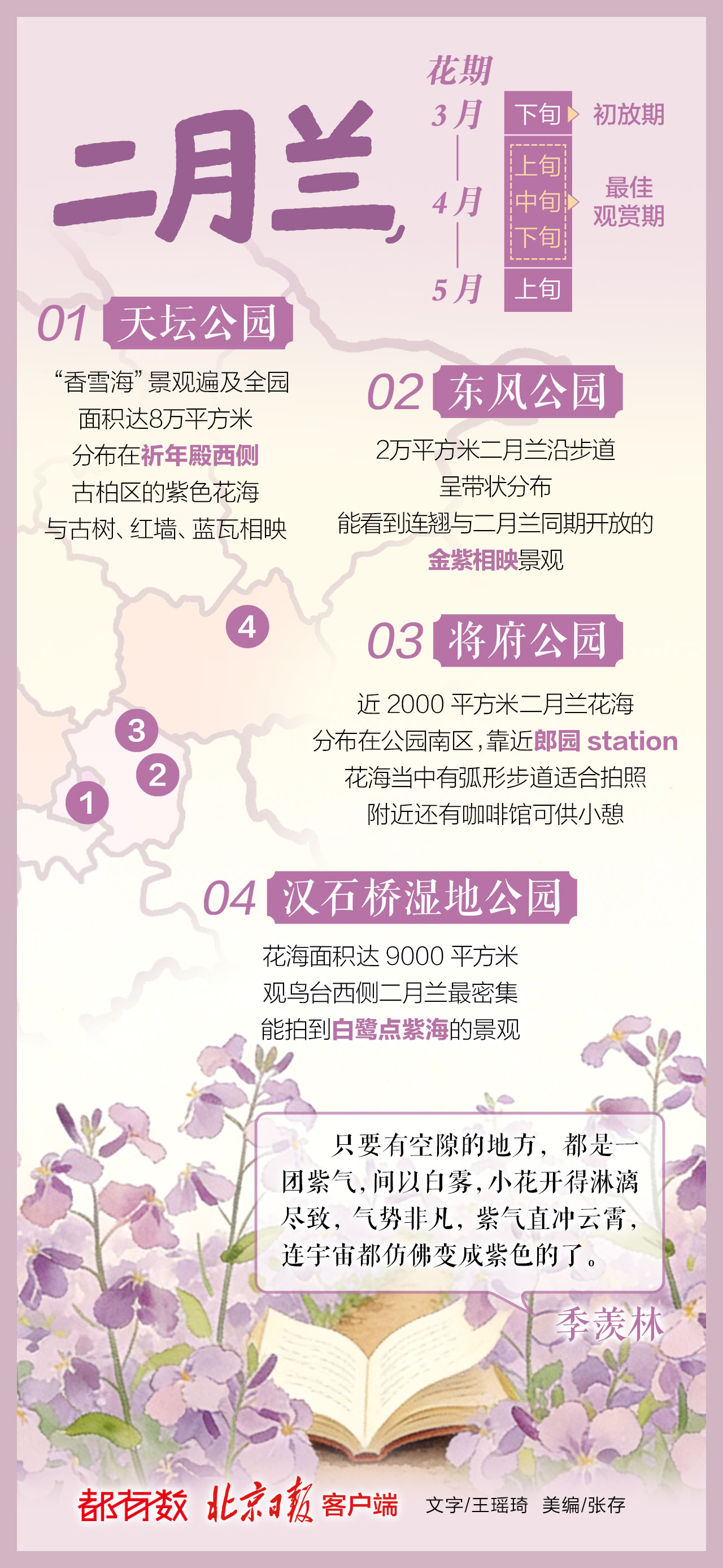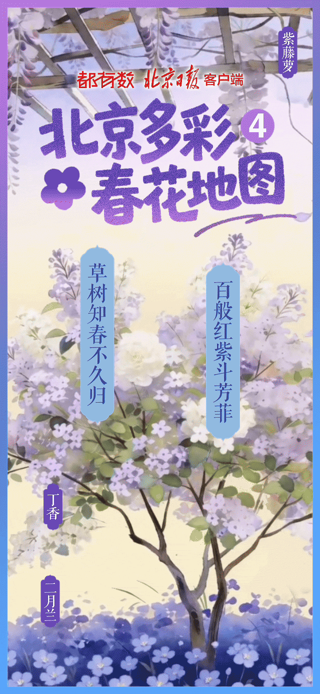 告别了早春的鹅黄与浅粉,北京迎来了最浪漫的紫色花季。淡雅的丁香吐露着芬芳,成片的二月兰在林下铺开柔软的地毯,满架的藤萝花则擎起一簇簇烟霞……这份“紫色花海”地图,带你走进一个如梦似幻的春日诗篇。