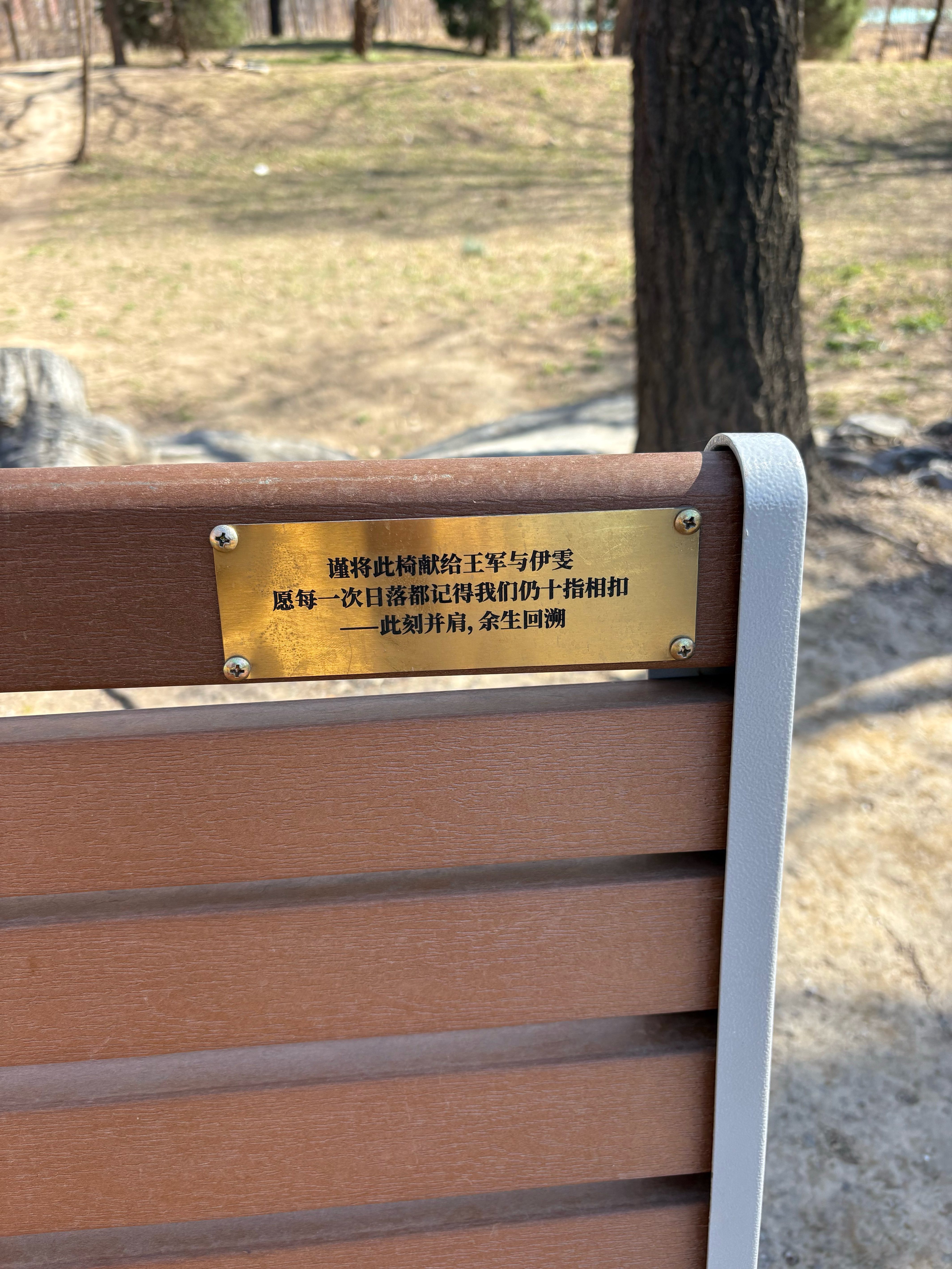 长椅的一角,镶嵌着一枚两指宽的金属铭牌,可以镌刻简短的字句。这是认捐者的温馨“树洞”,也成了游客的“彩蛋”。