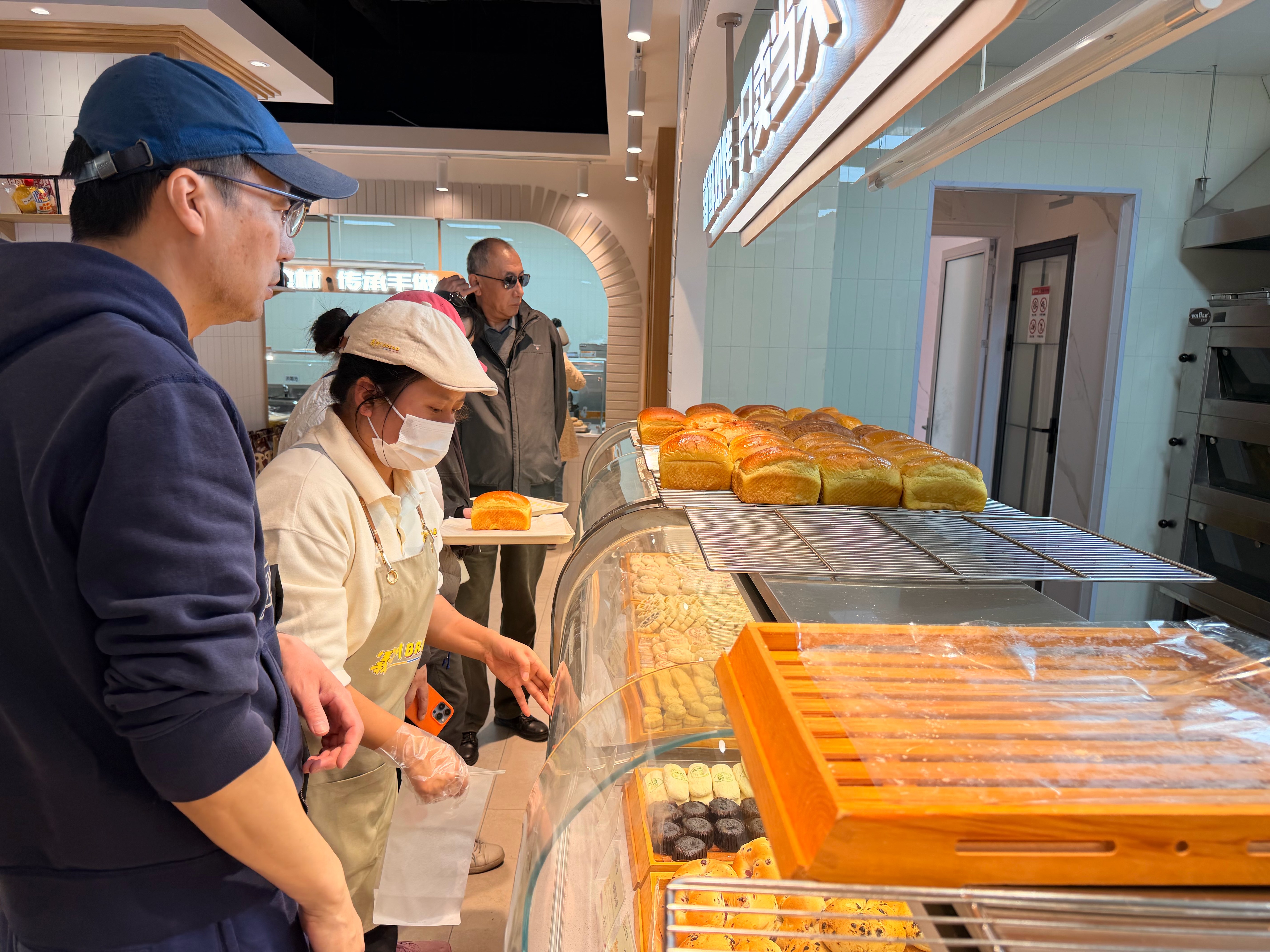 “春节假期我们特意去隆福寺市集买了义利现烤面包,没想到现在在家门口就能吃上总书记同款了!”一位大姐乐呵呵地说着,动手夹了一个果子面包和一个维生素面包放进托盘,又拿了些枣花酥和牛舌饼,“以前也买义利面包和点心,倒没吃过现烤的,还是这个好。”