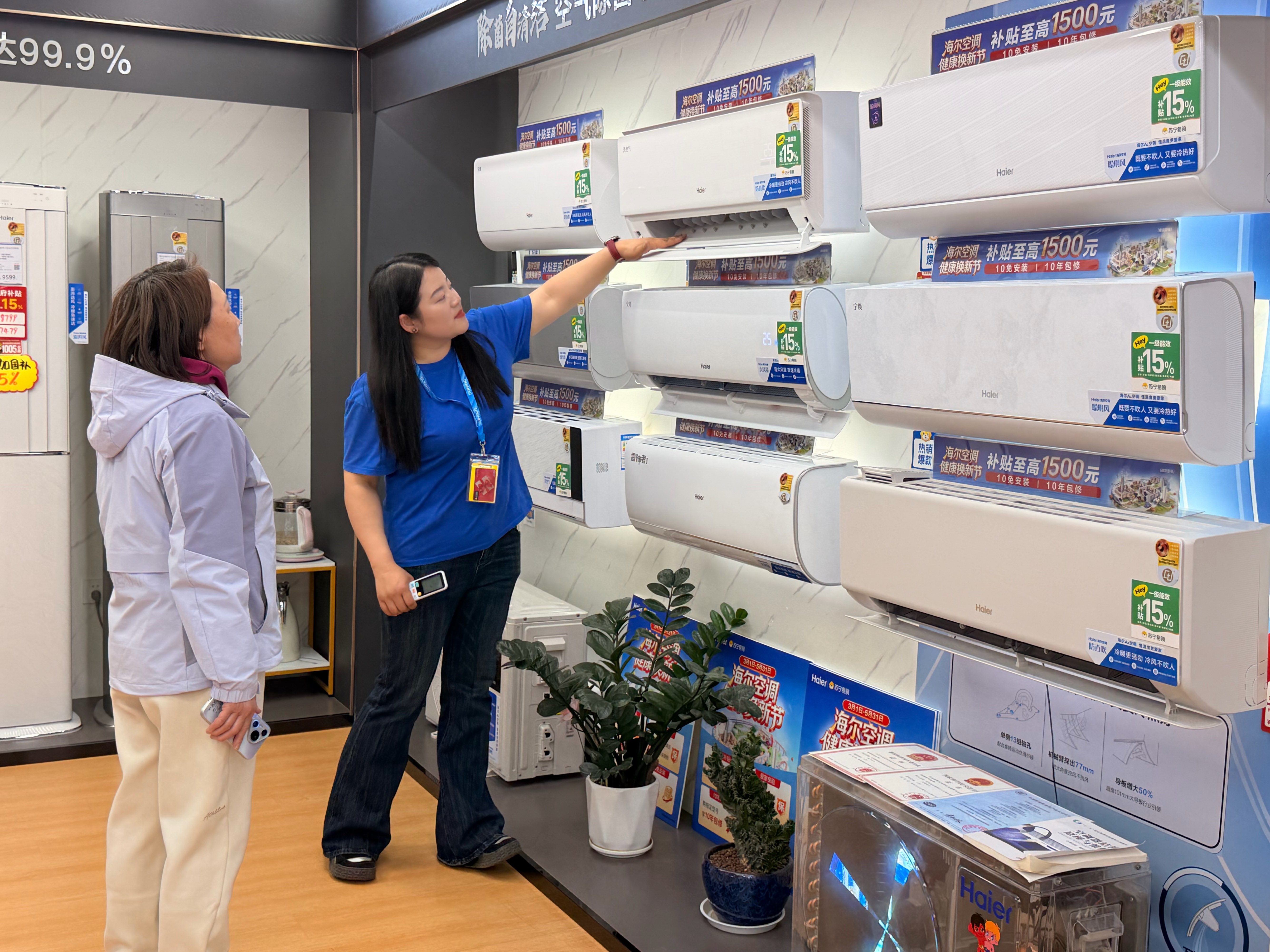 李大姐看中的海尔A700空气洗空调,就享受了国补、工厂、门店三重补贴。“这款空调市场价格是5399元,工厂和苏宁补贴后的售价是4099元,消费者还可以通过京通小程序领取国补资格,在此基础上再享受15%的国家补贴,算下来是3485元,总共便宜了1914元。”苏宁易购负责人介绍。