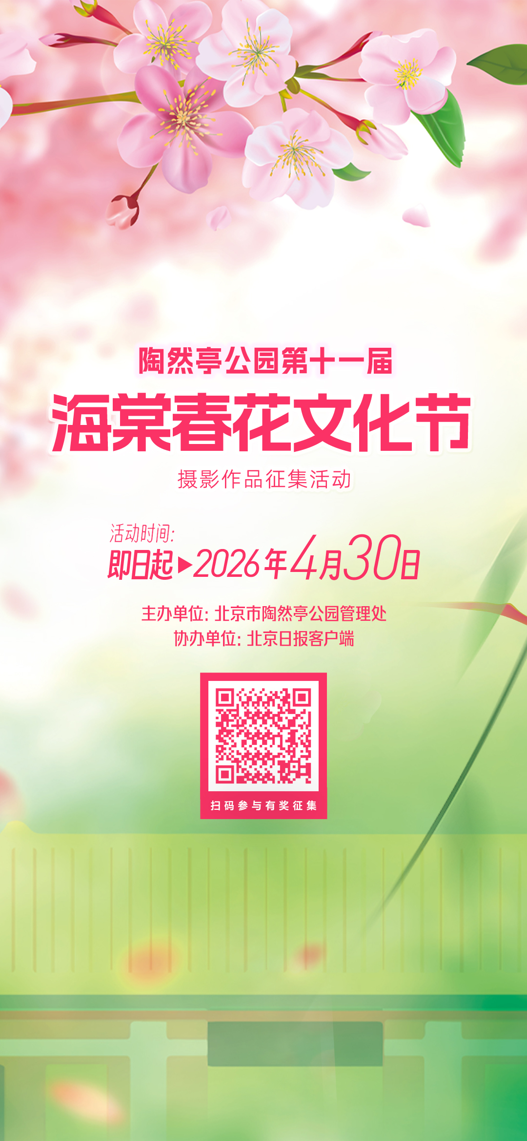 在这繁花似锦的时节,以“春悦陶然 棠香满园”为主题的陶然亭公园第十一届海棠春花文化节踏香而来。3月28日,由陶然亭公园管理处主办、北京日报客户端协办的摄影作品征集活动正式启动。我们邀请每一位热爱生活、热爱摄影的你,用镜头捕捉海棠及各类春花与陶然亭交相辉映的绝美瞬间。