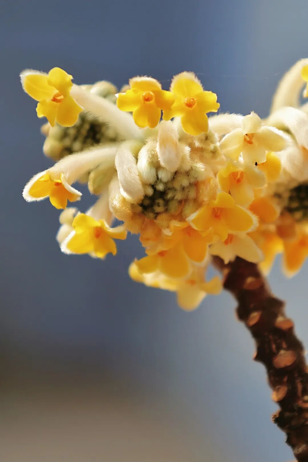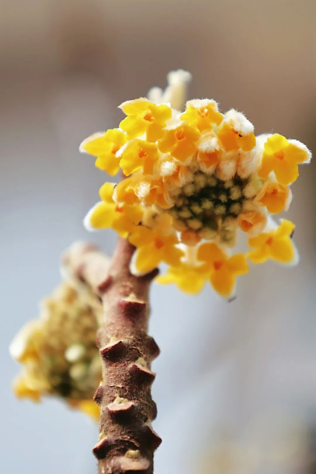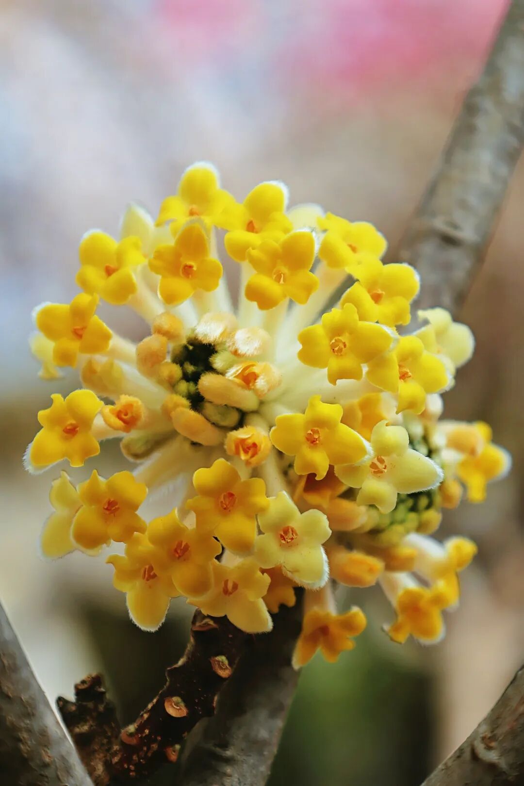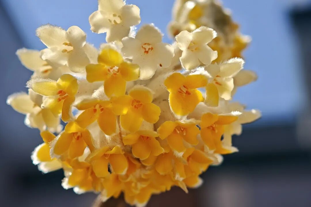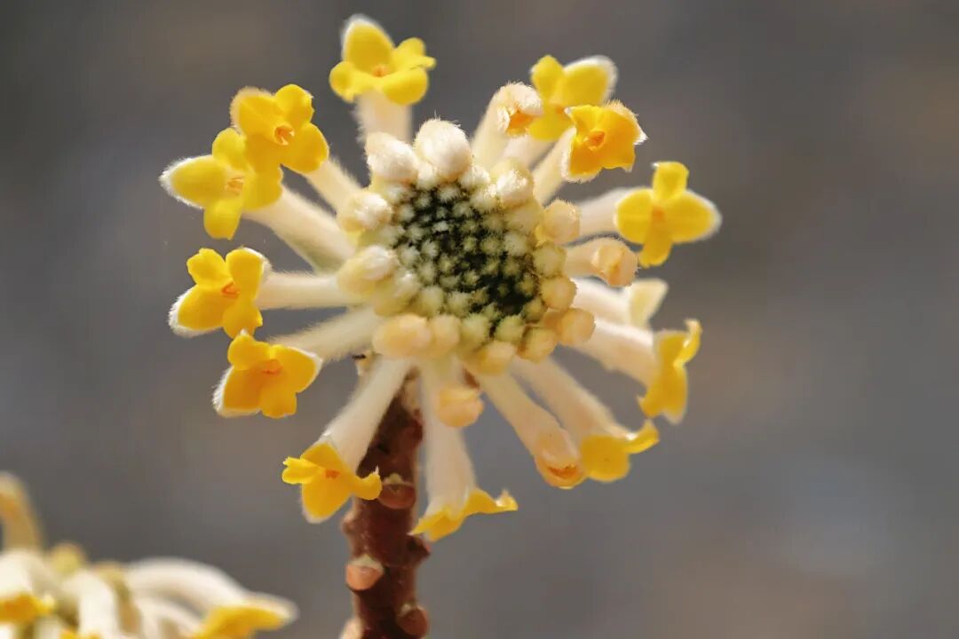 其实瑞香科的植物都没有真正的花瓣,这些所谓的小花是管状的萼,早春,形似花瓣部分的是裂成4片的萼筒檐部,但这并不影响结香的美,晶莹的丝状毛更能衬托出鹅黄的娇艳,花序由外向内渐次开放,最终开成饱满的半球状,绽放出如金色礼花的耀目光彩。