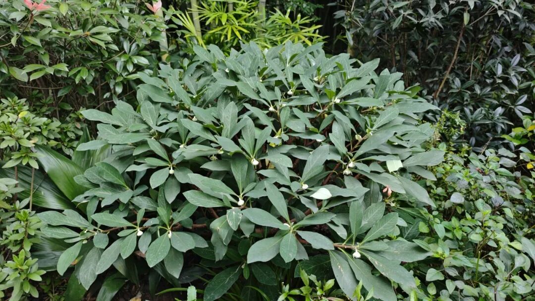 结香是落叶小灌木,小枝粗壮,常作三叉分枝。叶片通常聚集于小枝顶部,叶形极似枇杷。