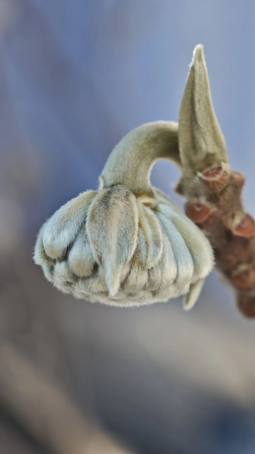 每年秋季,头状花序已经悄悄长成,几十朵密被白色丝状毛的小花簇拥成绒球状垂在枝头,像很多只毛茸茸的猫爪温柔地搭在一起,共同抵御冬季的寒冷。