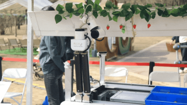 通过人工智能技术,这台机器人还能自主学习。“采摘时,机器会从下往上一个一个抓取草莓,在复杂场景下,它会自动清理障碍物后再抓取,这个过程是机器在仿真环境里自主学习、进化得到的。”谈到效率,熊亚表示,“我们现在采摘速度大概是8秒每果,而且可以24小时工作。”