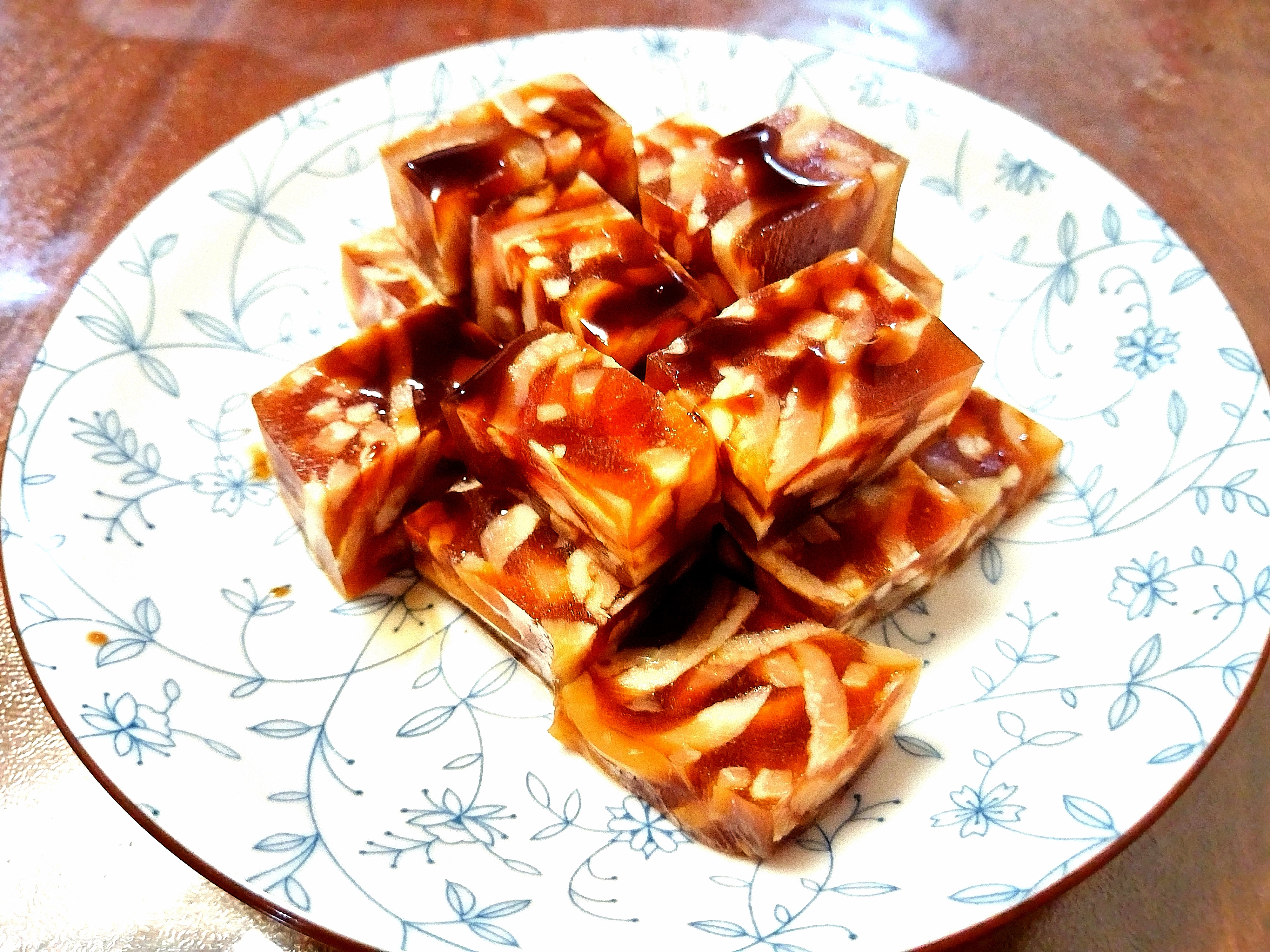 啥是肉皮冻?有人说那是源自北宋《东京梦华录》中的“水晶脍”,有人说那是清初努尔哈赤在冬季发明的猪肉美食,现在呢?在炎炎夏季的饭桌上,吃上一口用老汤熬煮的猪皮冻,清凉饱腹,肉皮清淡弹牙,汁水化身的冻儿如水晶般剔透可人,咬上一口,唇齿留香且回味十足。饭桌上,那一盘皮冻儿放置在青花小碟子里,一枚清秀朱红的花瓣点缀着白瓷盘,猪皮上用铁钳子烫印花纹如芙蓉出水,阳光照耀之下,纹路映出明黄色的光辉,煞是好看。
