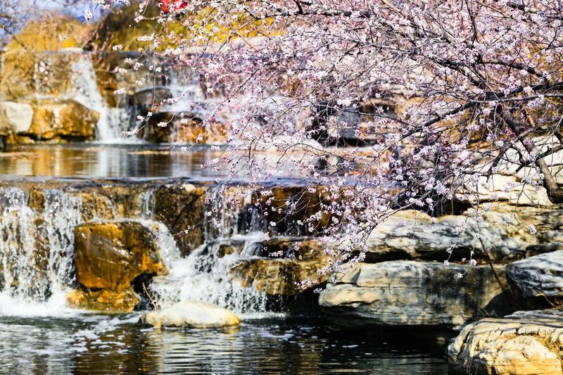 记者在现场看到,曹雪芹纪念馆西侧的山桃花溪已进入最佳观赏期,叠水潺潺蜿蜒流淌,清浅碧波顺石而下,粉白山桃临水而立、迎风舒展,层层花影倒映碧波之间,勾勒出温润恬淡的唯美意境。