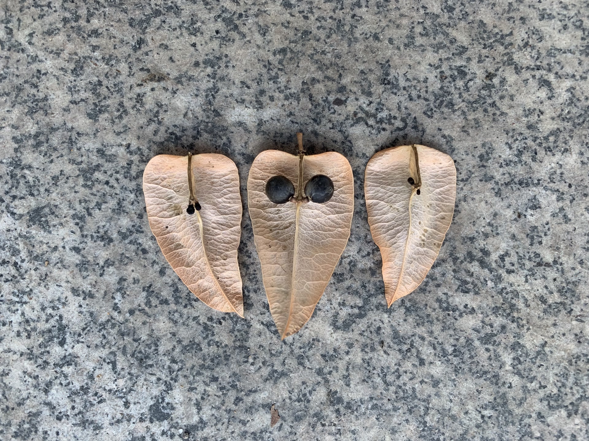 前两天早晨,路过西便门桥,在桥东南的路边,捡到两个栾树的落果,蒴果长椭圆状,卵形,3片膜质的薄翅组成了立体三角形的灯笼型,里面有两个黑而圆的种子,像涂了黑漆的小灯泡儿。仰头看,秋风中,一片小灯笼正向红褐色过渡,招摇着,有褐色的已经咧开嘴,隐约露出亮着光泽的黑豆豆。