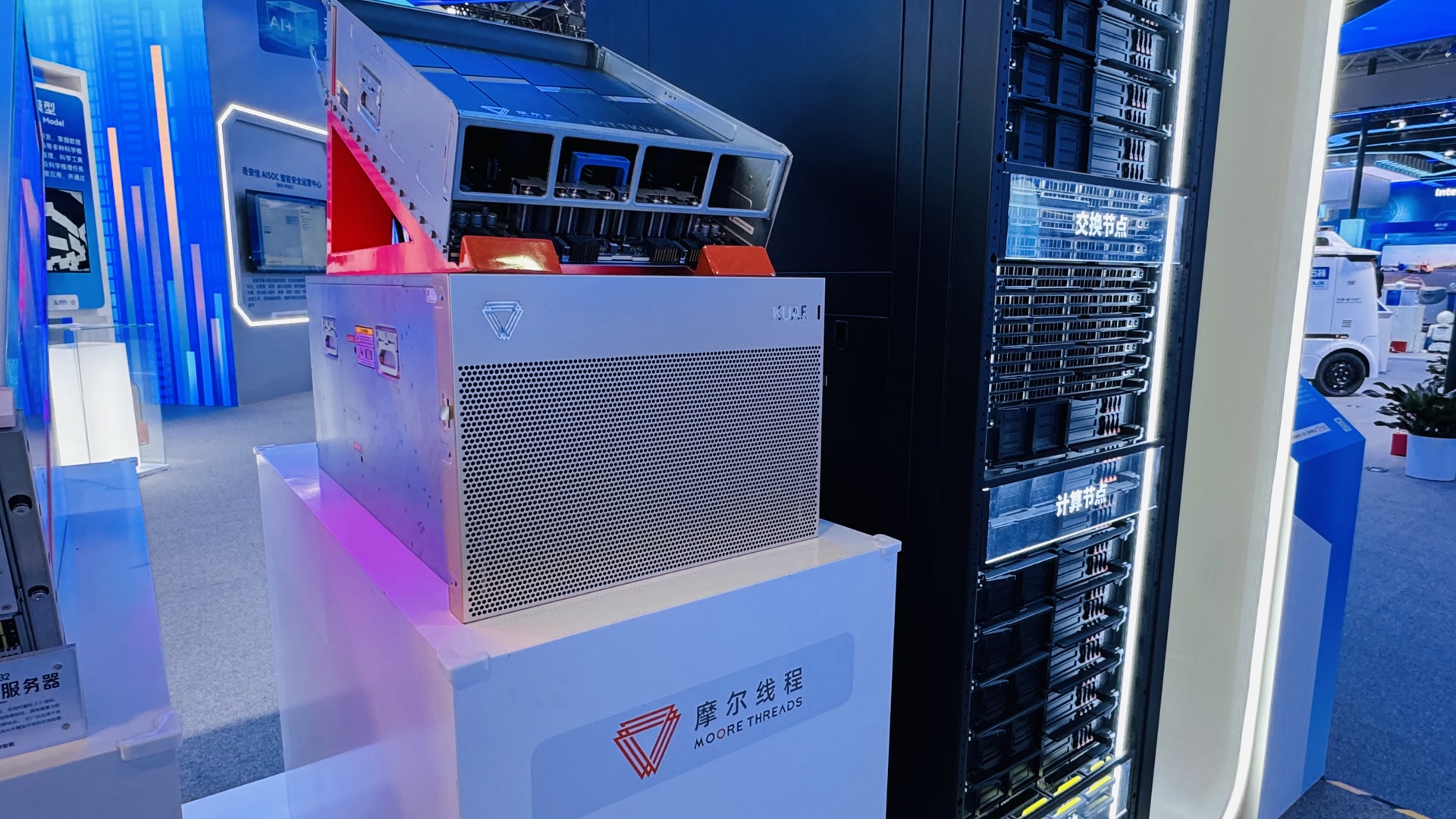 在今年中关村展示中心常设展首次设立的“人工智能+”展区,此前因跻身“国产GPU第一股”而备受瞩目的摩尔线程,带来了AI训推一体智算卡MTT S5000、搭载该卡的MCCX D800 X2液冷服务器、面向下一代超大规模智算中心的超节点架构设计等多项硬核成果。