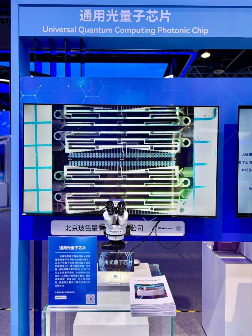 在常设展现场,玻色量子自研的通用光量子芯片首次亮相。据悉,该芯片突破了在薄膜铌酸锂材料上的高速电光调制量子操控技术,实现多个高保真度的两比特和多比特量子纠缠逻辑门,验证叠加态、纠缠态制备能力,完成如量子神经网络、图像识别、化学分子基态能量求解等多场景量子算法,构建通用光量子芯片架构和技术路线。