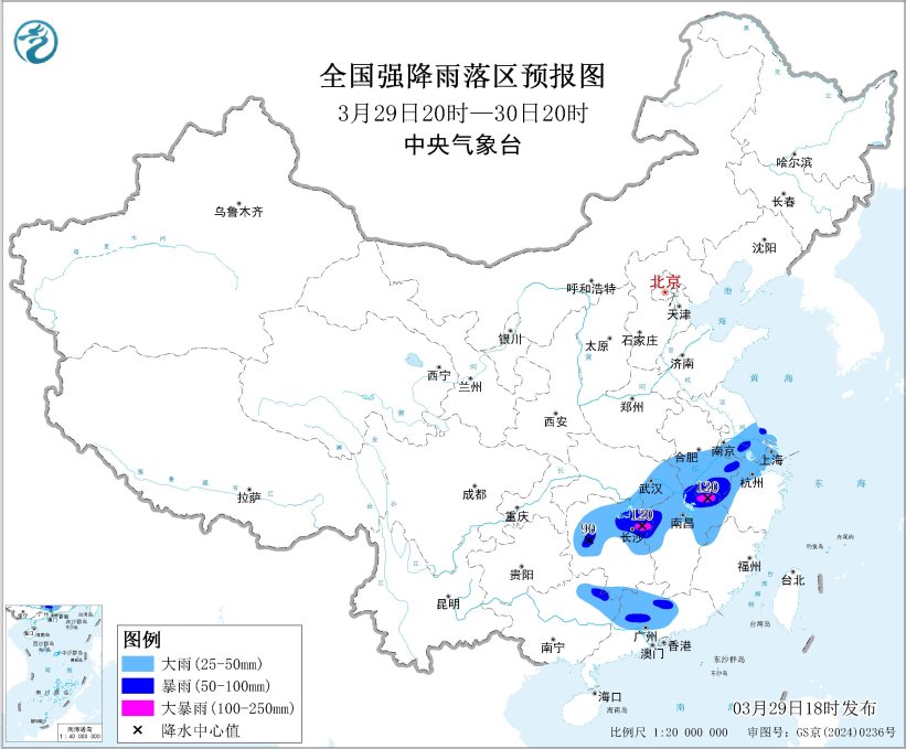 预计,3月29日20时至30日20时,湖南中北部、江西中北部、湖北东部、安徽南部、江苏南部、浙江西部以及广西东北部、广东中北部等地部分地区有大到暴雨,其中,湖南东北部、江西东北部等地部分地区有大暴雨(100~120毫米)。上述部分地区伴有短时强降水(最大小时降雨量20~50毫米,局地可超过60毫米),局地有雷暴大风等强对流天气。
