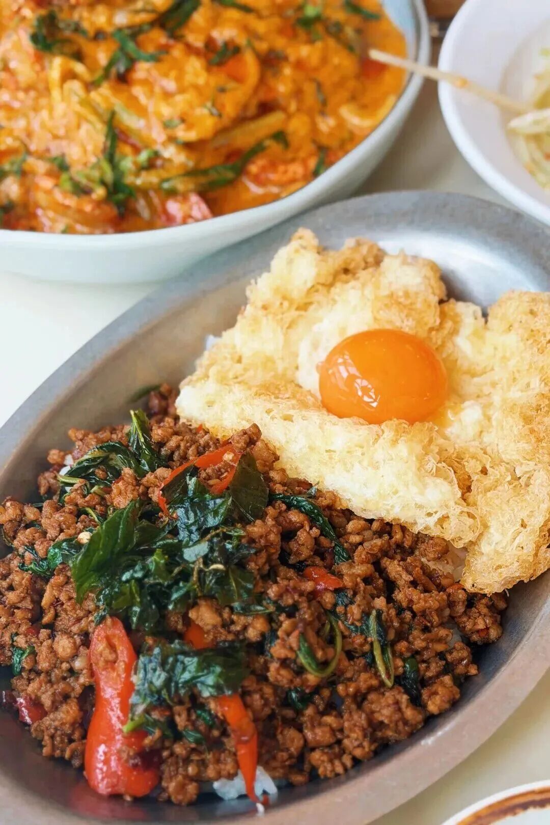 上海的OROR开到北京三里屯北区了!这个品牌也是fine系列旗下的,装潢有非常多的可爱细节,主做各式泰餐(漂亮饭版),拍照很出片📸。【著名OROR打抛饭】上的炸蛋是他家非常有辨识度的特色之一,老吃家们都会戳开蛋黄拌饭~【古法泰式咖喱虾】咖喱汁偏甜,有鸡蛋碎增加浓稠度,虾肉也十分新鲜。