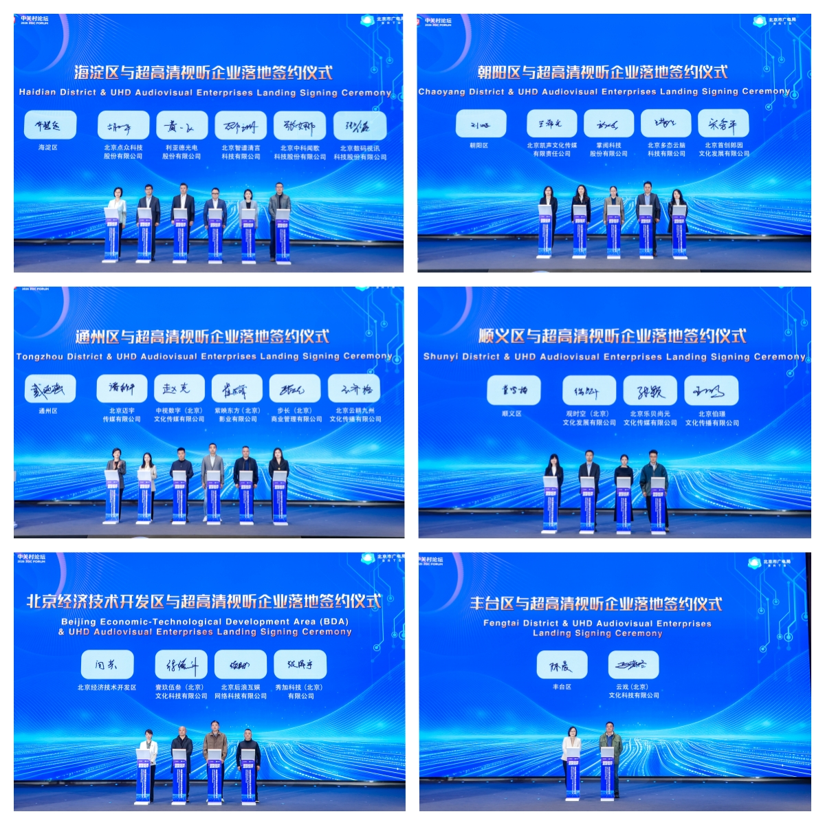 论坛发布签约环节高潮迭起,以政策赋能、资金护航、生态扩容、金融助力为超高清视听产业注入磅礴动能。北京“超现场”生态共同体建设暨全国覆盖启动仪式举行,标志着“超现场”产业从单点探索走向生态协同,从区域试点迈向全国布局,奏响超高清视听场景全国普及的奋进号角。北京市各区与超高清视听企业举行落地签约仪式,推动优质项目集聚落地,共同开启合作新篇章。北京银行发布“百亿新视界”专项行动方案并举行启动仪式,与广电视听企业签署金融合作协议,以金融力量为产业高质量发展保驾护航。