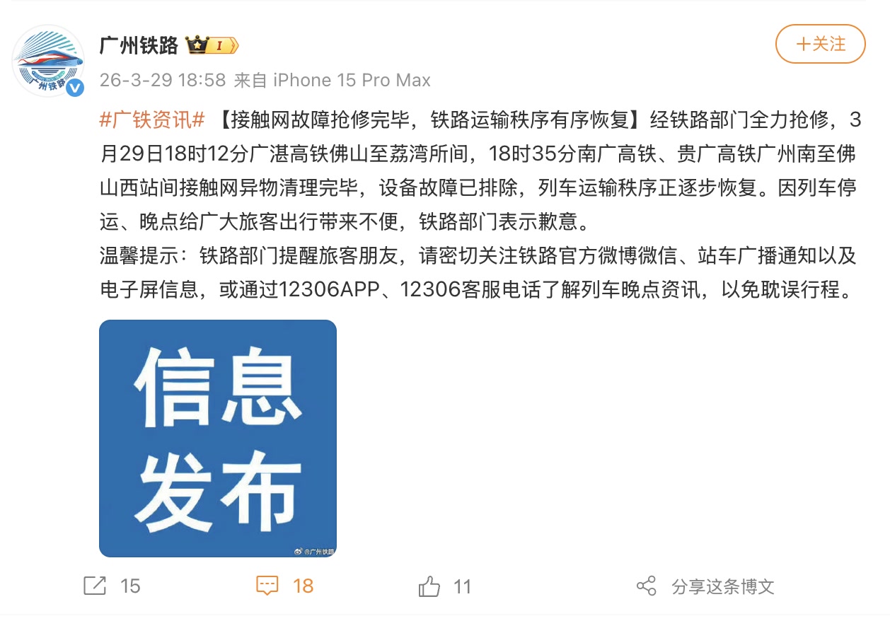 经铁路部门全力抢修,3月29日18时12分广湛高铁佛山至荔湾所间,18时35分南广高铁、贵广高铁广州南至佛山西站间接触网异物清理完毕,设备故障已排除,列车运输秩序正逐步恢复。因列车停运、晚点给广大旅客出行带来不便,铁路部门表示歉意。