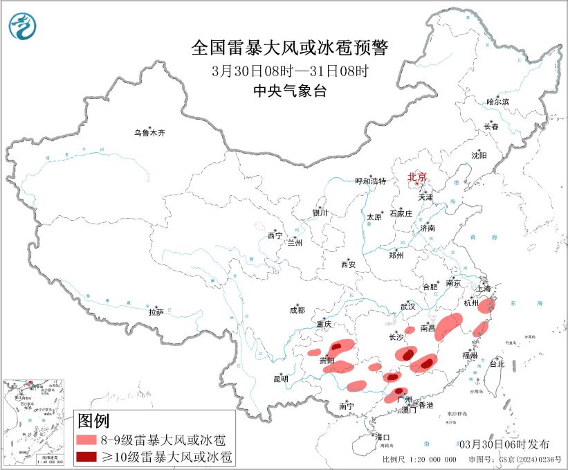 预计3月30日08时至31日08时,西南地区东部、江南中东部、华南等地的部分地区将有8级以上雷暴大风或冰雹天气,其中,湖南东南部、江西南部、贵州中东部、广东中部和西北部等地的部分地区将有10级以上雷暴大风,最大风力可达11级以上,局地不排除出现龙卷的可能性;西南地区东南部、江南中东部、华南等地的部分地区将有小时雨量大于20毫米的短时强降水天气,其中,江西南部、福建东南部、广东中部和西北部等地的部分地区小时雨量大于50毫米,最大可达80毫米以上。