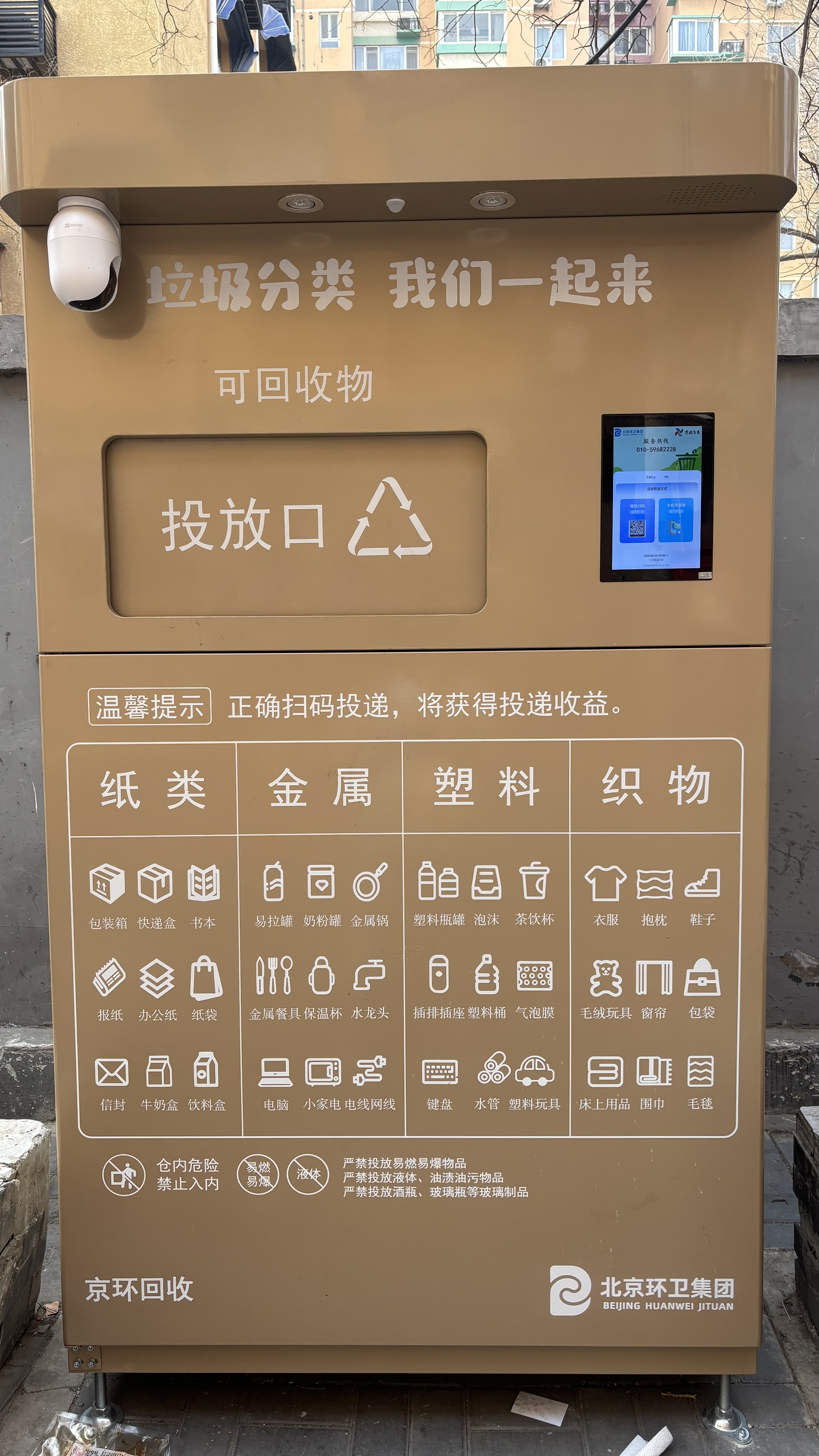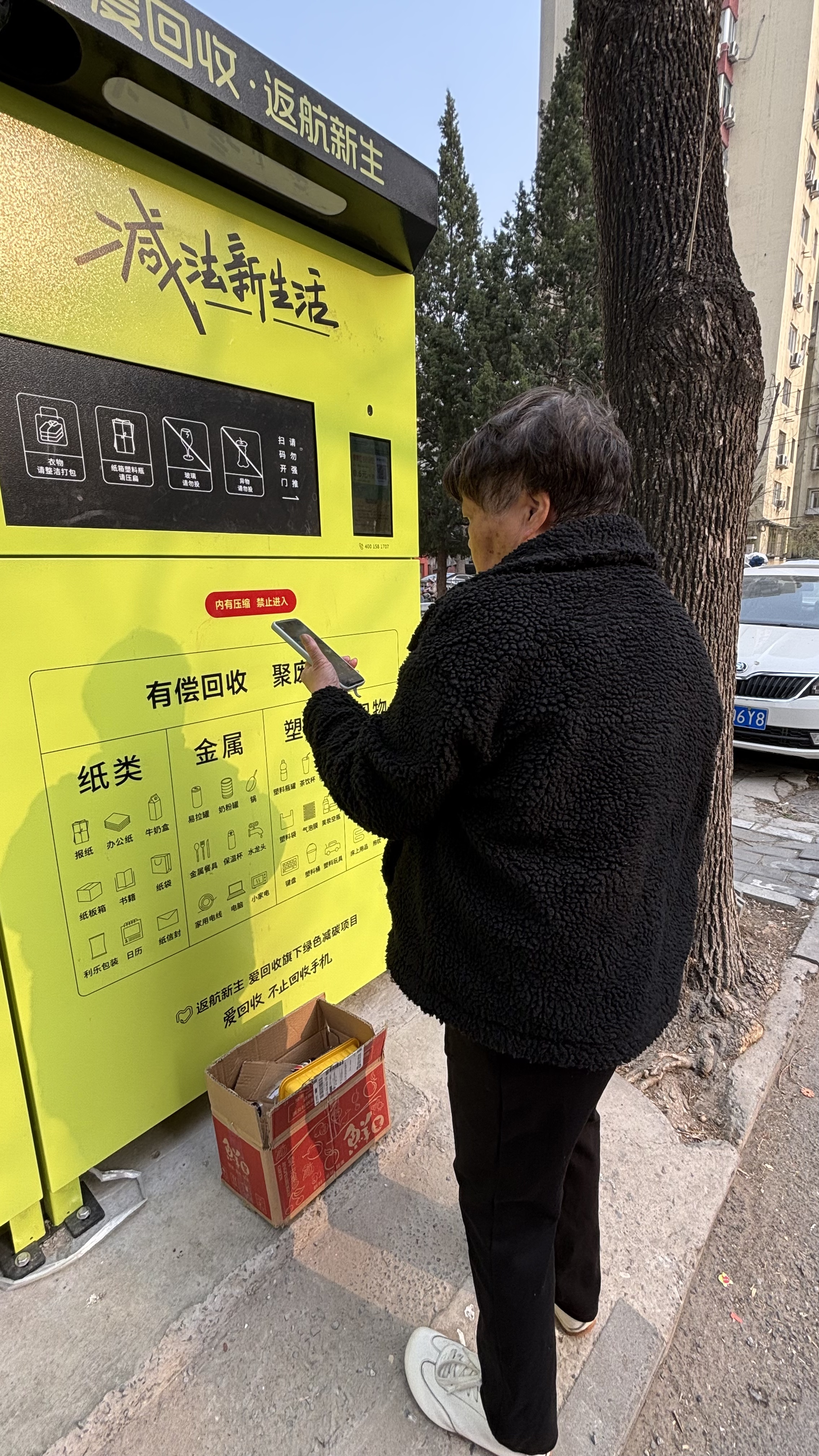 “您好,欢迎使用智能回收箱!”在自新路南口,靠墙放置着一台两米多高的金棕色铁皮箱。当有路人驻足凑近至半米左右距离,便会被摄像头“捕捉”,听到这句热情的“揽客播报”。