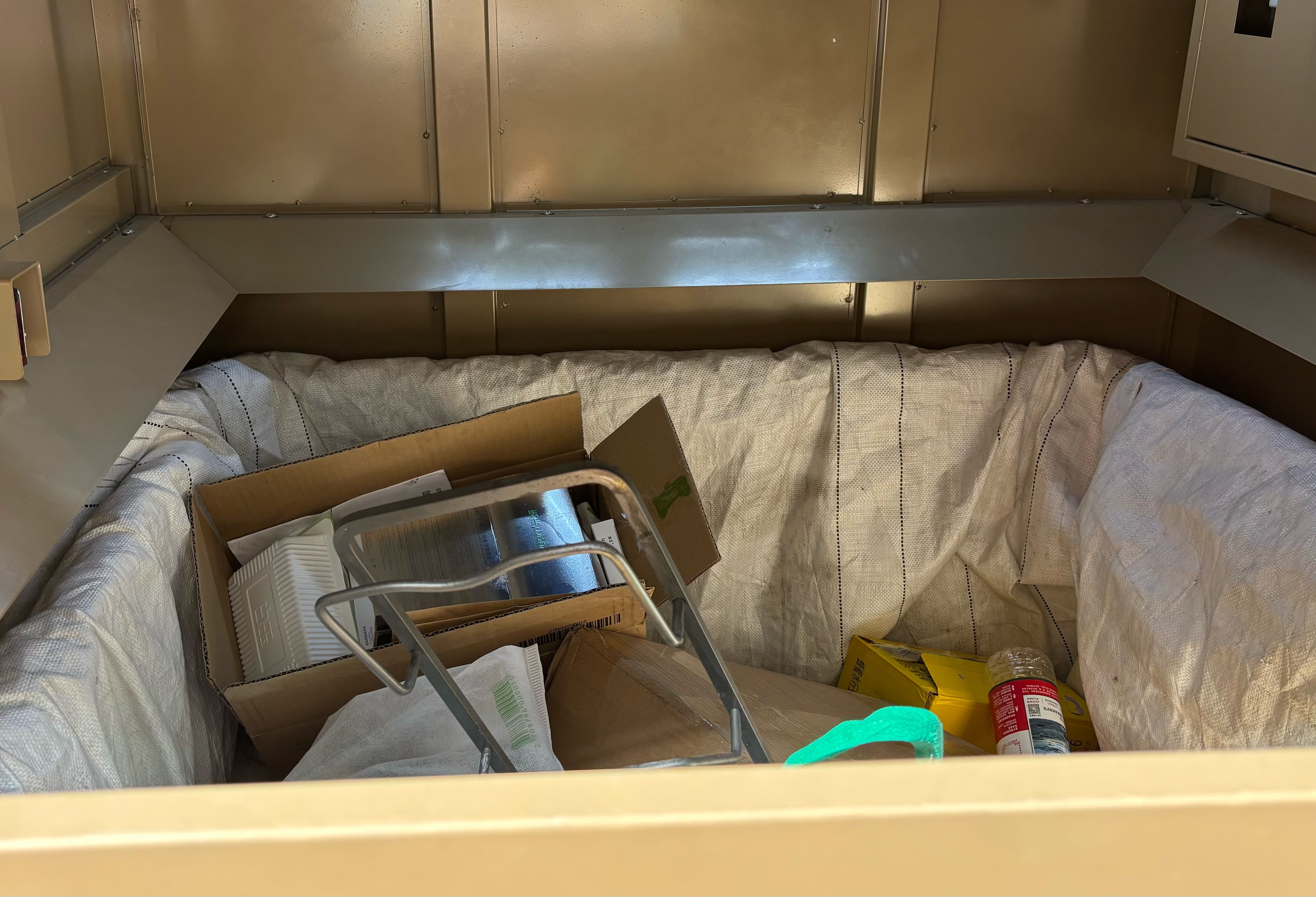 在蒲安北里小区内的“爱回收”机器前,一位居民将快递盒连同矿泉水瓶等一起投入,收益显示为0.34元。她回忆使用机器约半年,账户内共积累了22元。“平时天天下楼,收个快递啥的,就随手往里一投,这不省事儿了嘛。”